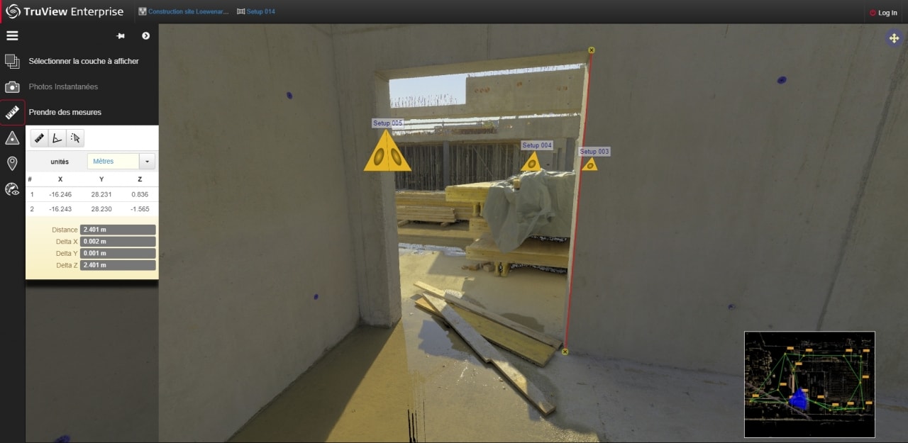 Aujourd'hui, il est possible de déployer des équipements de relevés 3D sur site en un temps record. Vous pouvez scanner votre site en construction et contrôler en temps réel l'avancement des travaux. La mise à disposition de ces visualisations est simplifiée et facilitée par des outils logiciels adaptés pour la prise de décision et la collaboration. Ces données sont accessibles partout avec votre téléphone, tablette ou au bureau sur votre ordinateur. Vous gagnez un temps précieux pour vos équipes et vos clients et accélérez la prise de décision.