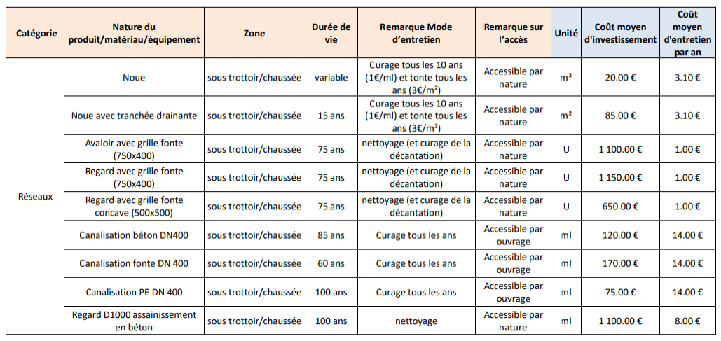 Exemple d'un Tableau des coûts d'investissement et d'entretien