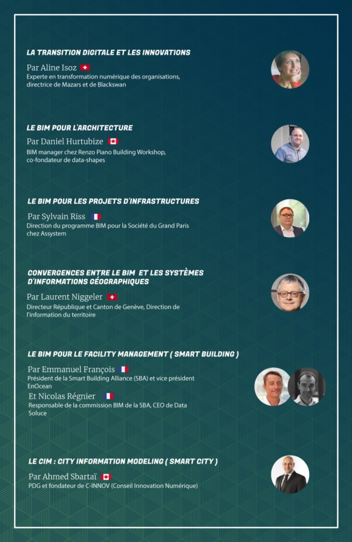 9h – 9h30 : Aline Isoz est une experte Suisse en transformation digitale, fondatrice et directrice de Blackswan, désormais active au sein du groupe Mazars, vice-présidente du Conseil d'administration de Globaz SA, membre du Conseil de la Fondation Suisse des paraplégiques, membre du Conseil d'administration des Services Industriels Genevois et de VO Energies. Elle ouvrira la journée avec une conférence la gestion de projets stratégiques liés à la numérisation, la digitalisation des processus et l'implémentation des systèmes d'informations.