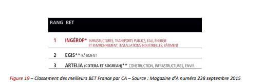 Les trois plus grands BET en France en 2015 sont INGEROP, EGIS et ARTELIA.