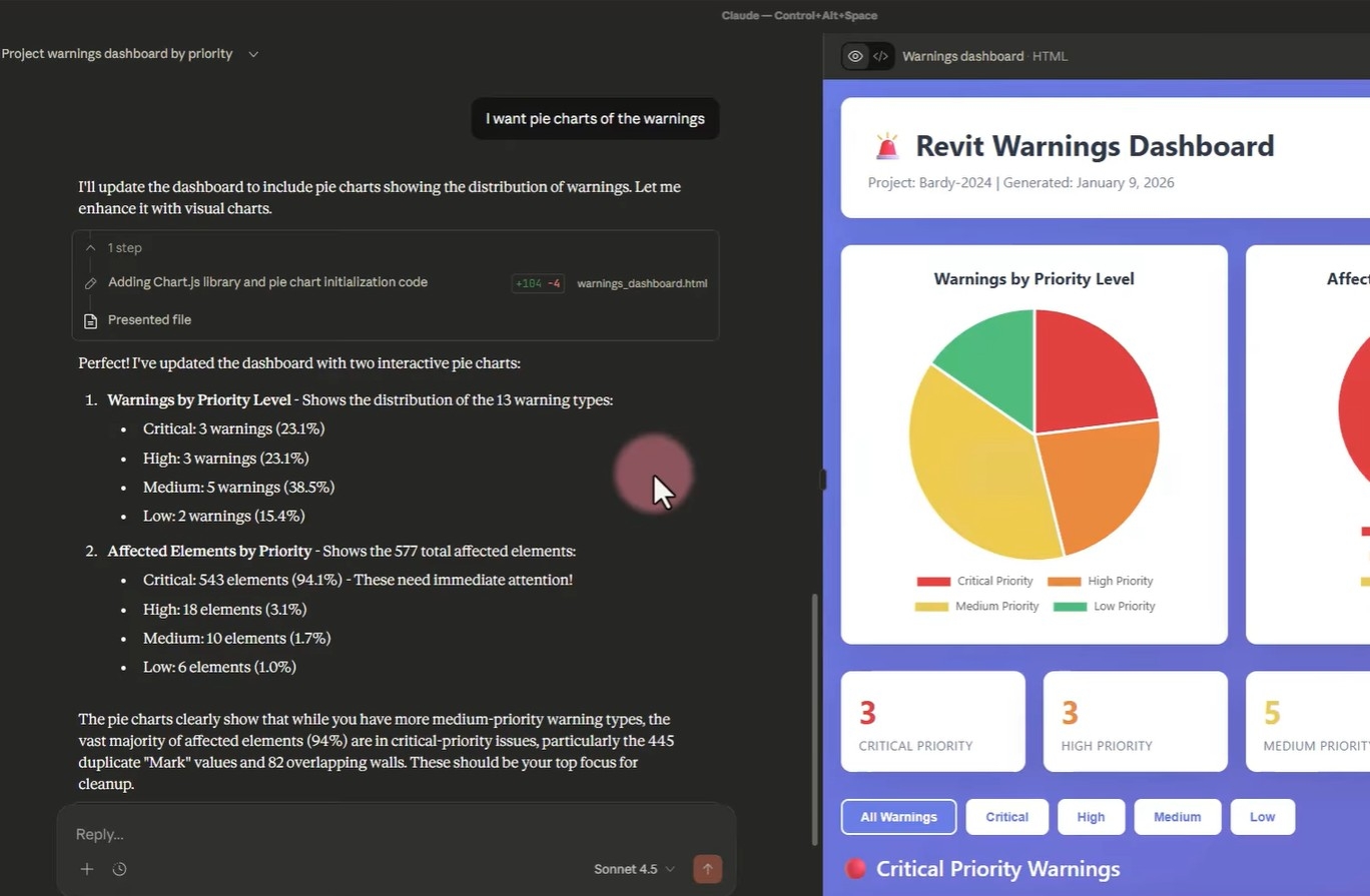 La gestion des avertissements (warnings) est souvent une tâche fastidieuse. Dans la démonstration de BIM Pure, l'utilisateur demande simplement à Claude :