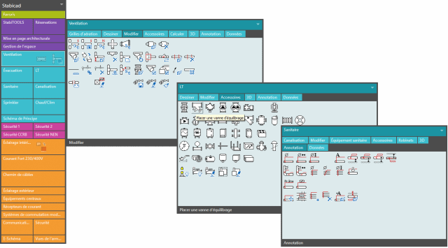 Nous travaillons sous Revit et AutoCAD à l’aide de la même interface. Nous incorporons aux deux logiciels une palette identique qui permet un accès facile de l’utilisateur à toutes les fonctionnalités possibles de Stabicad. Un travail important a été fait sur l’ergonomie du produit.