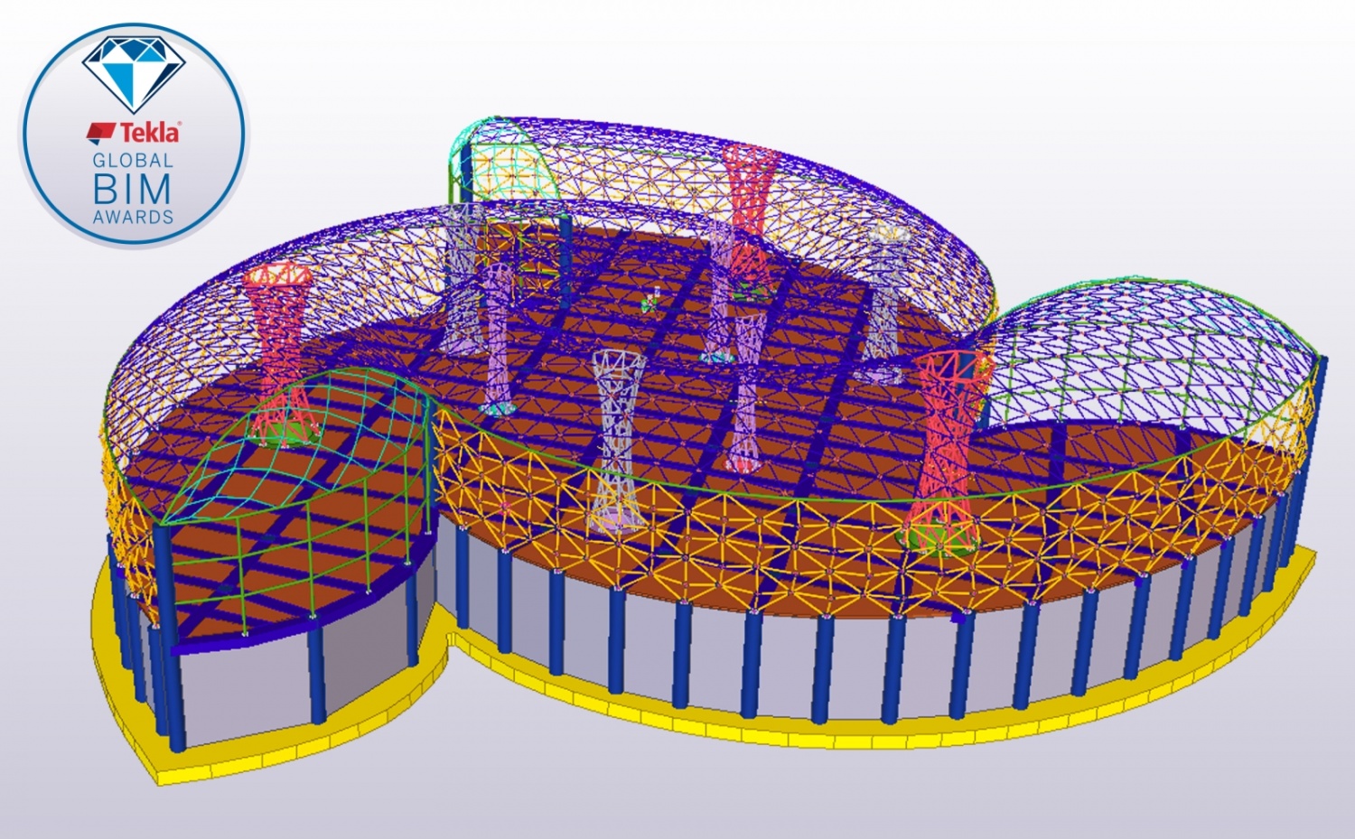 BlackSea-TORM, un bâtiment d'exposition conceptuel célébrant le développement durable. Les étudiants à l'initiative de ce projet ont su utiliser le BIM de manière innovante par interopération, en employant Tekla Structures conjointement avec divers autres outils. Ils ont aussi créé, à l'aide de Tekla Open API, un « Rufer » personnalisé, c'est-à-dire des détails de connexion semi-paramétriques, pour le système MERO du toit.