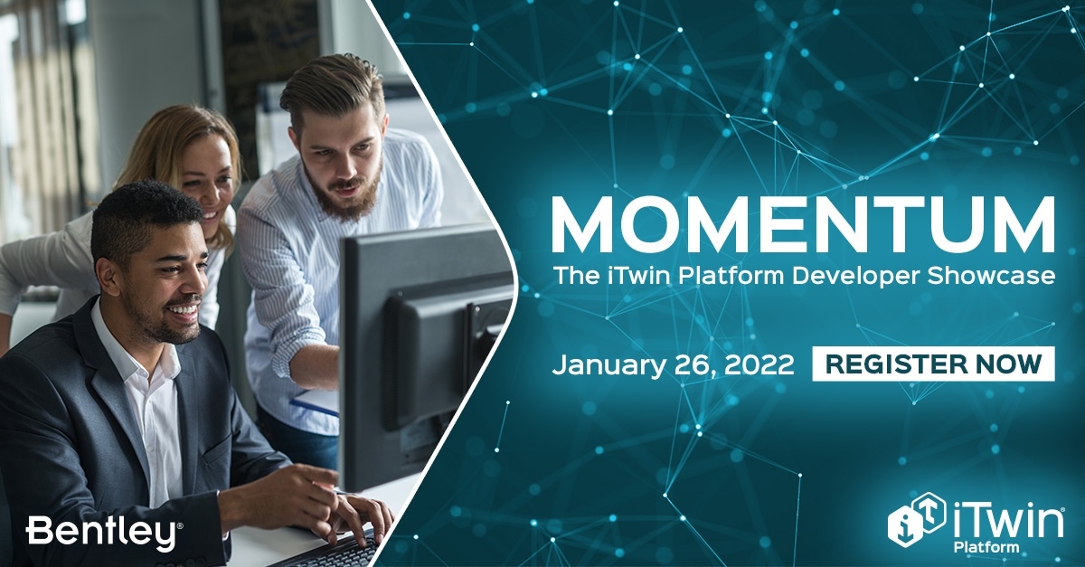 Participez à MOMENTUM le 26 janvier 2022 et assistez aux présentations inspirantes de développeurs utilisant la plate-forme iTwin. EarthCam, Digital Energy, Agile Handover et bien d'autres encore partageront leurs solutions de jumeaux numériques et expliqueront comment elles aident leurs clients à progresser sur le plan numérique.