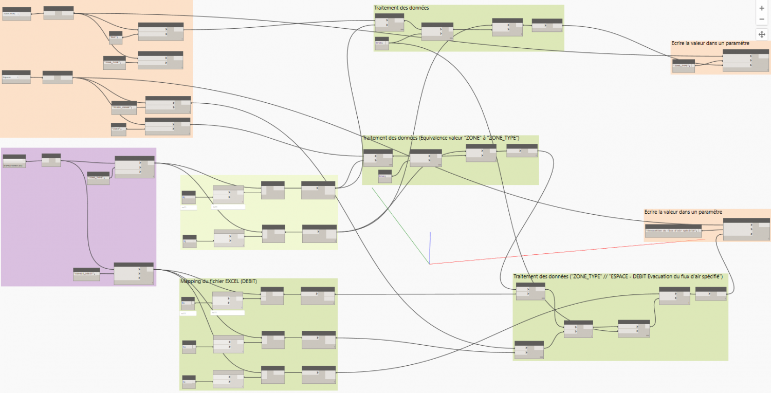 Dans l'exemple fourni, il s'agit d'écrire la valeur "Evacuation du flux d'air spécifié" dans l'entité "ESPACE" suivant la valeur "ZONE_TYPE" et "PIECE_USAGE".
