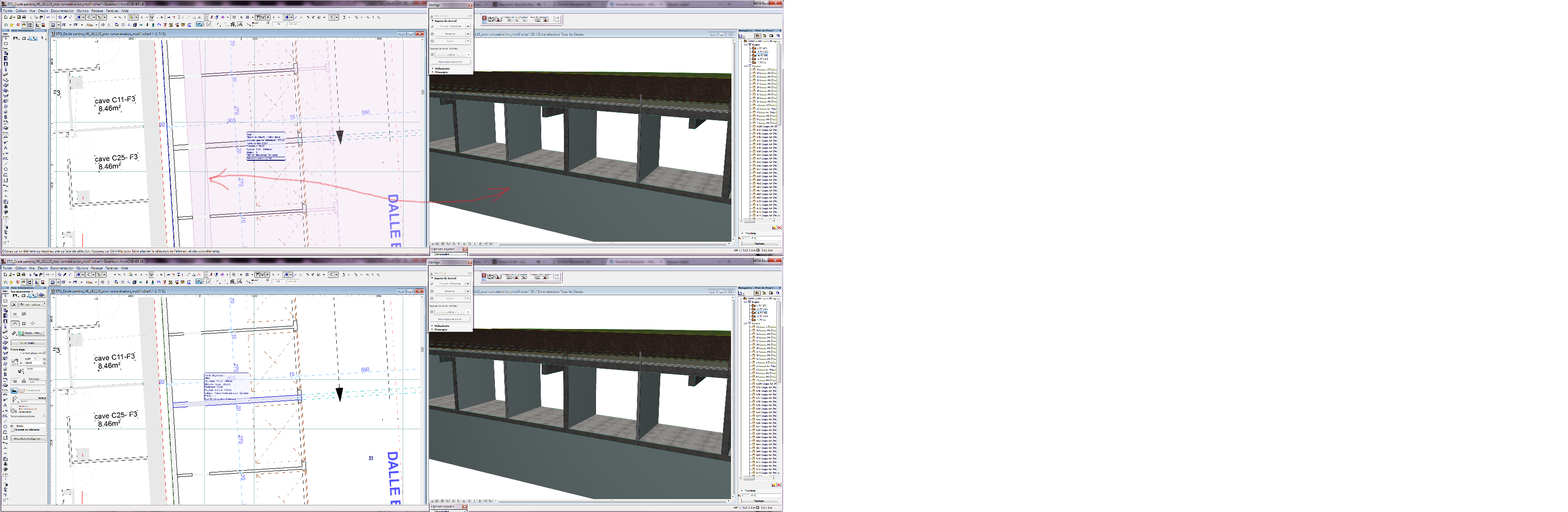 2/ plus gênant : quand des murs qui sont au SS -1 coupent la trajectoire du mur qui est au SS -2, bien qu'il ai été arasé, il y a une sorte de découpe fantôme que je ne sais pas maîtriser. Cela pourrait se réglé en passant le mur du SS -2 en "visible à l'étage d'insertion uniquement" mais c'est impossible car mon SS -2 est sonstitué de 2 demi-niveaux. Je dois donc laisser mon mur en "visible à tous les niveaux appropriés".
