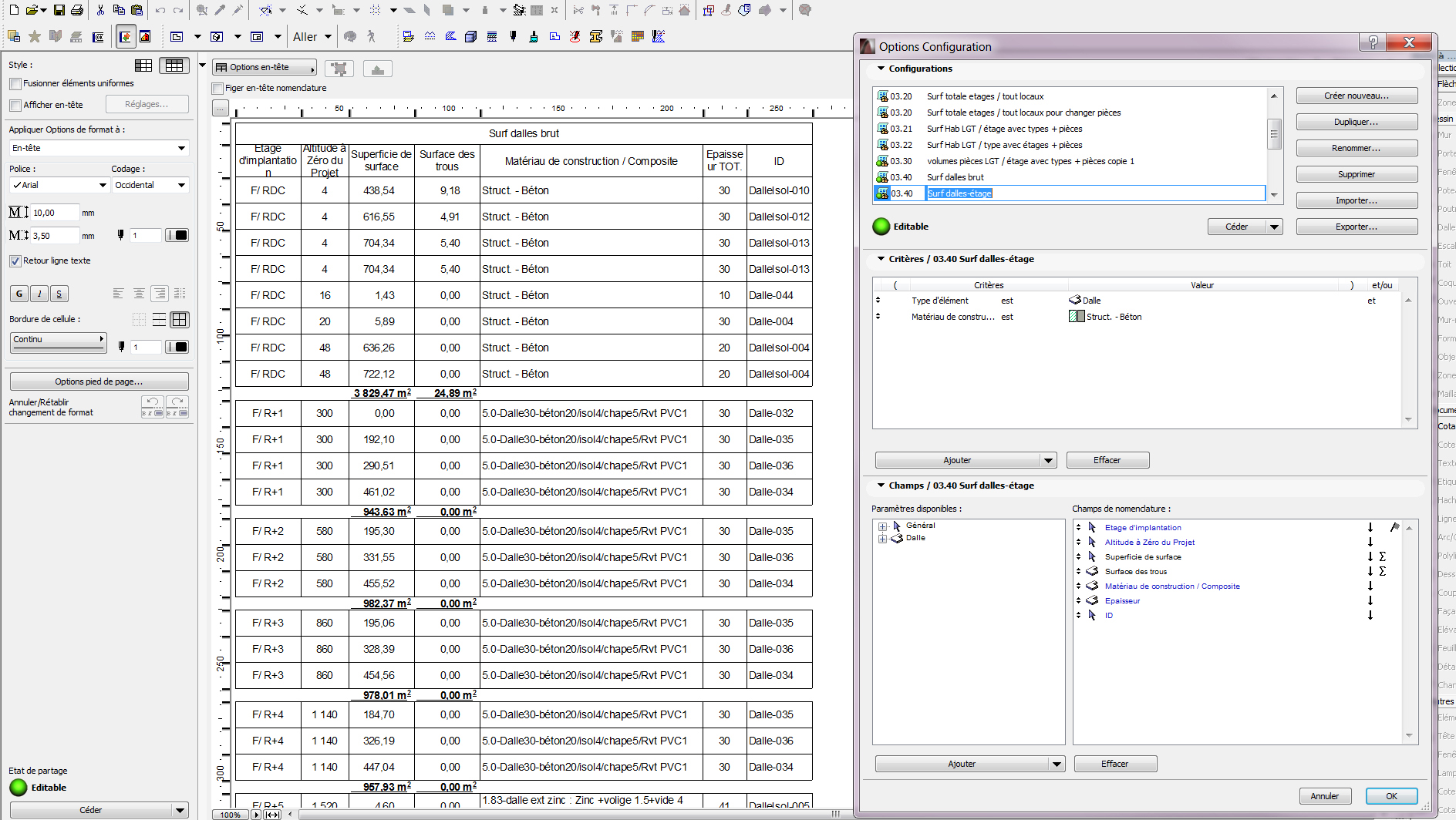 A - J’exporte cette nomenclature pour l'utiliser dans un projet archicad 17 : la sélection des dalles ne comporte que les dalles béton simples => aucune dalle composite même si le matériaux béton en fait partie.