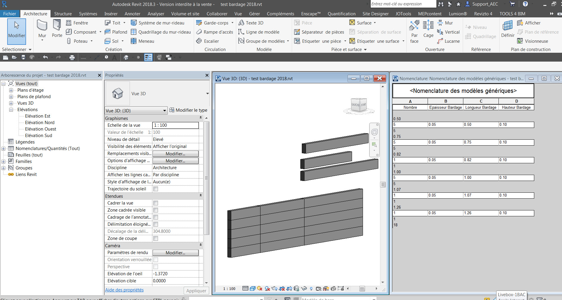 J'ai créé un modèle générique avec 3 paramètres partagés hauteur largeur longueur, j'ai tout mis en paramètres d'occurence c'est mon choix cela peut être hauteur et epaisseur en type et la longueur en occurence pour modifier facilement les longuerus sans à avoir à recréer un type à chaque longueur. puis j'ai fait une nomenclature avec les champs intégrants les dimensions et on peut facilement compter en fonction de la longueur de ton bardage...
