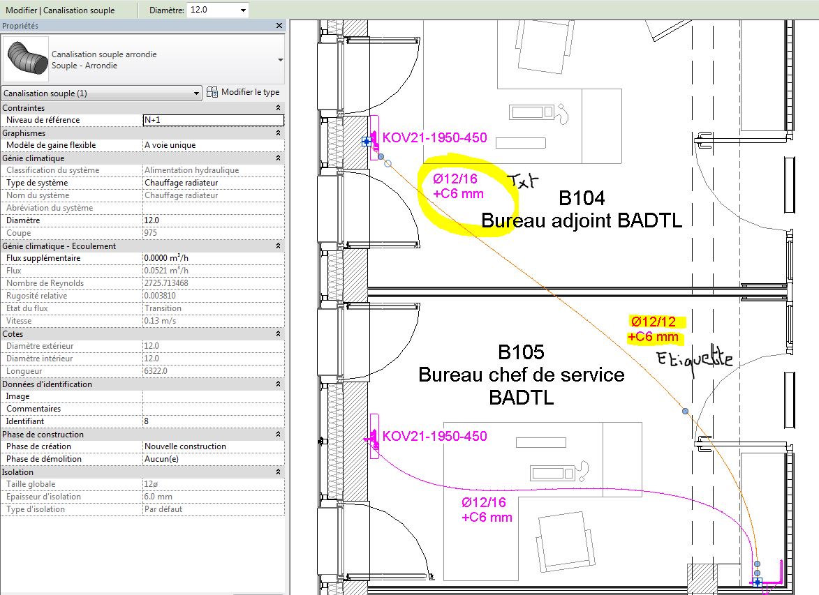 Ce n'est pas un problème qui me bloque pour autant, à savoir que je met la canalisation souple avec le bon diamètre intérieur, mais je suis obligé de les annoter avec du texte normale, donc moins efficace que ce que l'on a l'habitude de voir avec Revit.