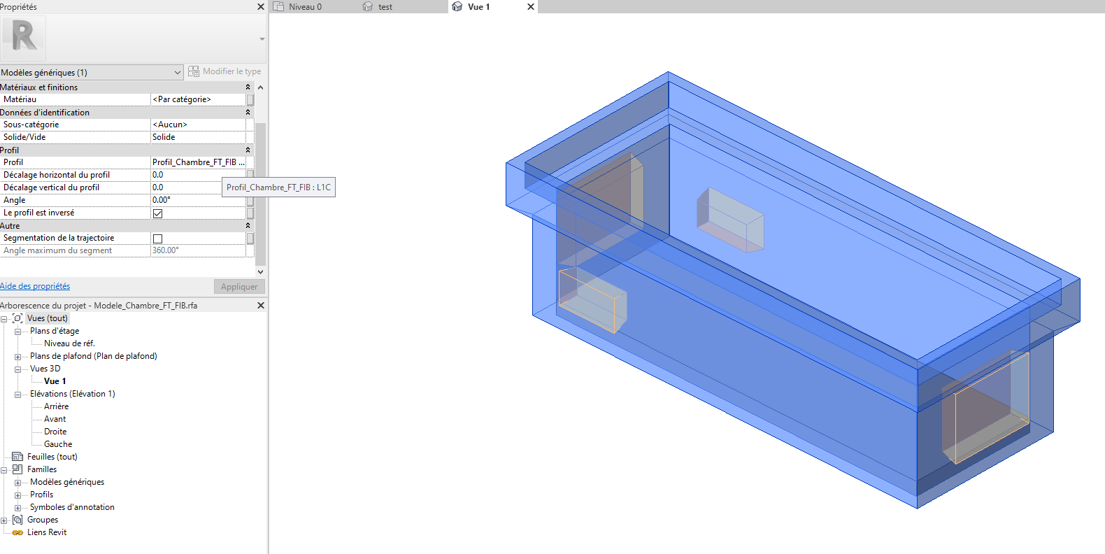 Je l'ai chargé dans mon modèle générique métrique (ligne) correspondant à ma famille Caniveau pour me permettre de faire une extrusion basée sur ce profil, malheureusement je n'arrive pas à conserver le caractère paramétrable de la géométrie.