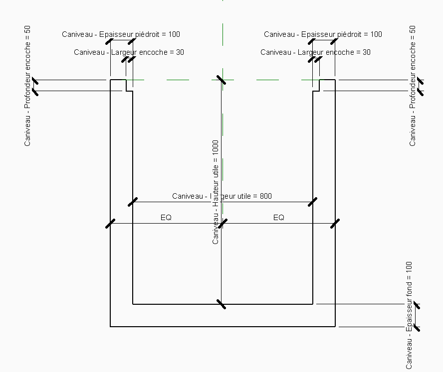 - Création d'un profil métrique correspondant à la section en travers du caniveau en paramétrant les différentes côtes via des paramètres partagés