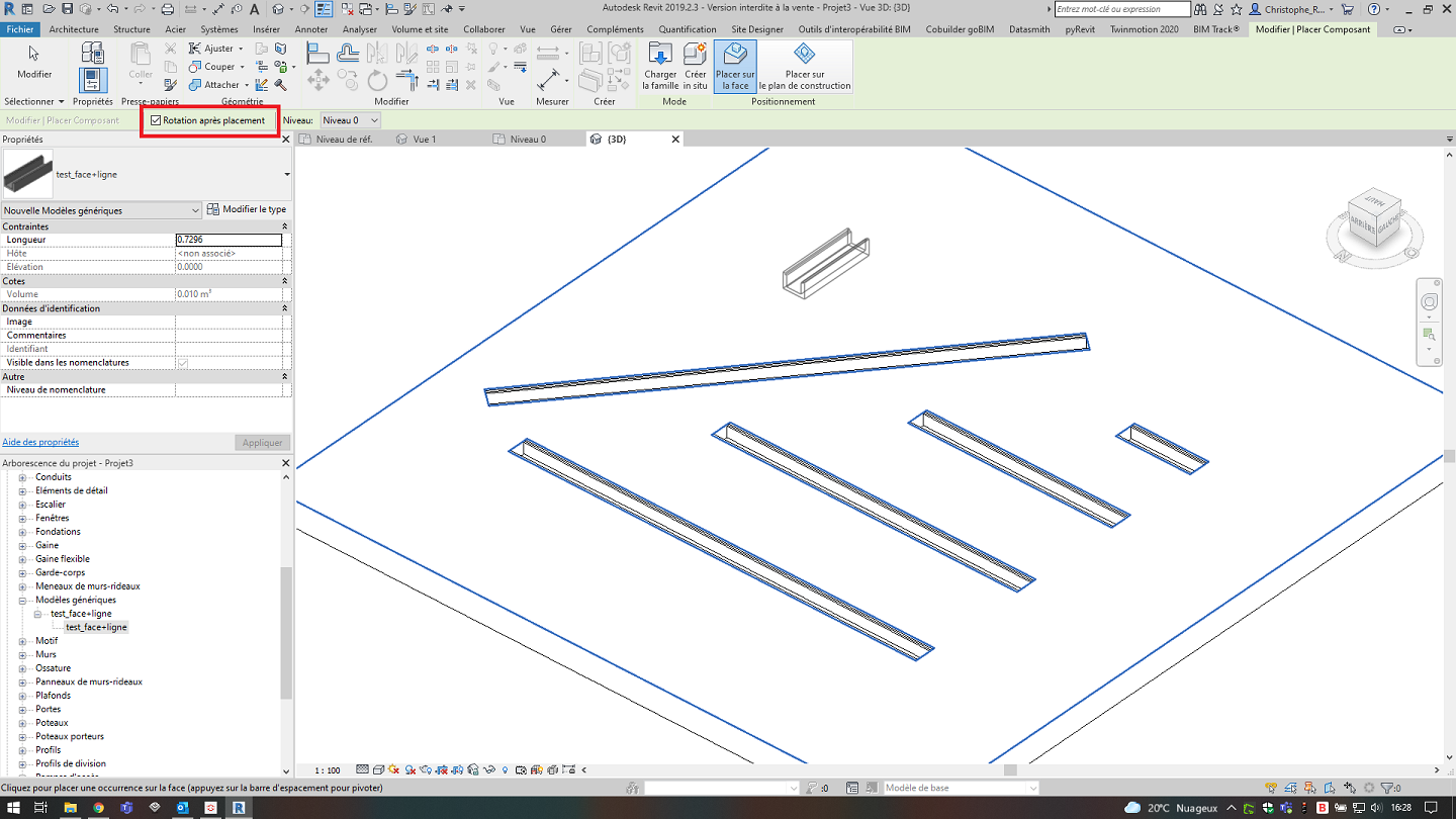 - Création d'une famille générique métrique (ligne) incluant une extrusion par chemin de la section en travers précédente, le chemin étant la ligne de référence,