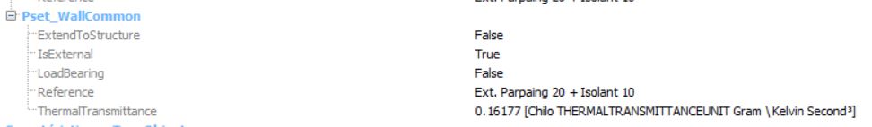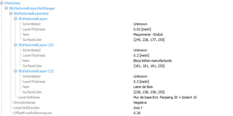 Lorsque j'ouvre mon IFC exporté dans un viewer, je retrouve dans les propriétés : le nom de l'objet, sa résistance thermique totale mais je ne peux pas identifier les différentes couches constituants la paroi et donc les propriétés thermiques/épaisseurs de chaque matériau. (Je précise que le mur est modélisé en multi-couches, ce qui est requis pas les softs de thermique.)