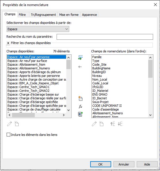 Pour les éléments de type "appareil sanitaire", "Bouche d'aération" et équipement de "génie climatique" on peux choisir des champs ce trouvant dans les espaces ou les pièces.