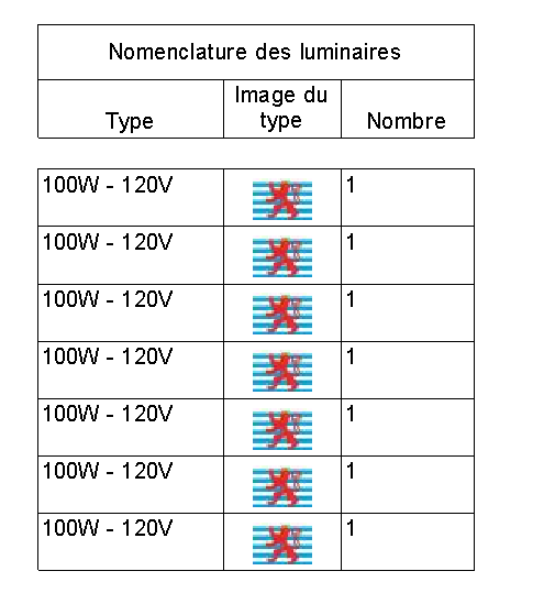 Pour y mettre une image, tu dois modifier la famille. Dans l'éditeur de famille, tu vas dans type de famille et dans le groupe "données d'identification" pour le paramètre IMAGE DU TYPE tu vas chercher une image de type BMP, JPEG, TIF, PNG de ton choix. Tu recharges ensuite ta famille dans le projet, tu verras apparaître dans la nomenclature que tu auras au préalable placé sur une feuille d'impression ( sinon tu n'auras que le chemin de l'image dans ta nomenclature) ton image avec le nombre et le type de luminaire.