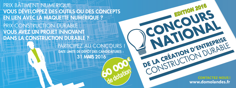 J'organise au sein de la Technopôle DOMOLANDES le Concours National de la Création d'Entreprise Construction Durable qui s'adresse à tous les porteurs de projets innovants ainsi qu'aux entreprises de moins de 3 ans et doté de 60 000 € de prix.