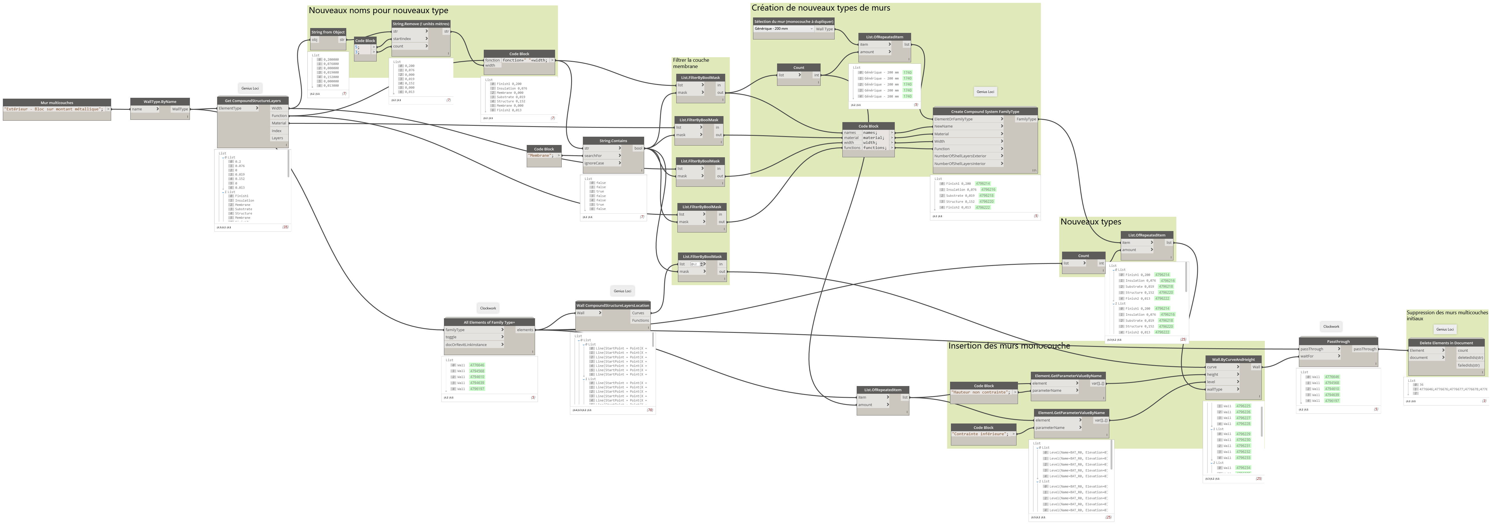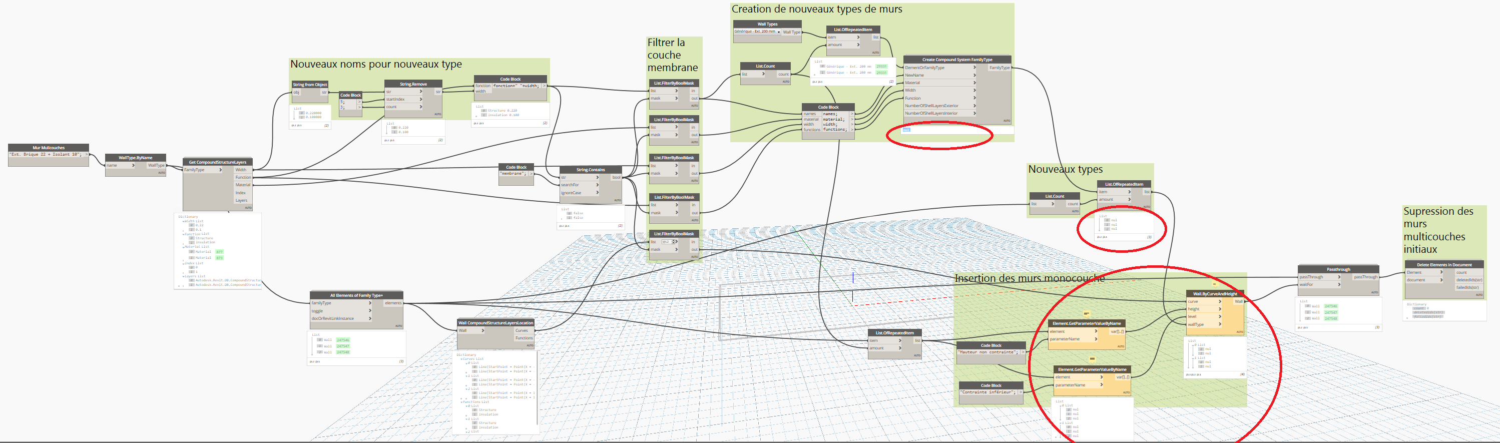 2_Pour le remplacement des murs monocouches par un mur multicouche qui est plus complexe, je t'invite à créer un nouveau sujet sur https://forum.dynamobim.com/ ou l'interface est beaucoup plus appropriée pour expliquer les étapes d'un graph dynamo.