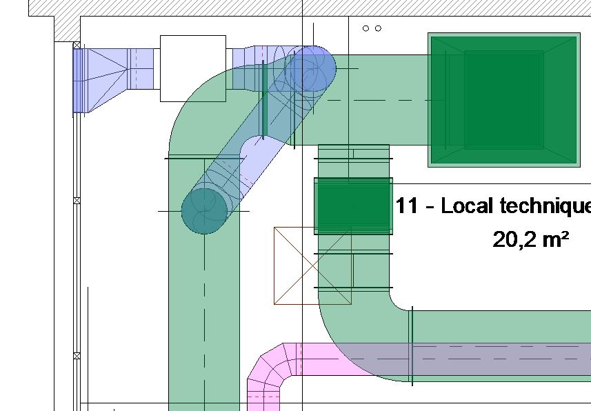 Salut, J'ai fait le test et je pense que le souci vient de la méthode. Au lieu de mettre des filtres sur les systèmes, tu dois créer un type de matériau pour chaque système. Pour la transparence, tu vas dans VV pour appliquer une transparence sur les gaines et les raccords.