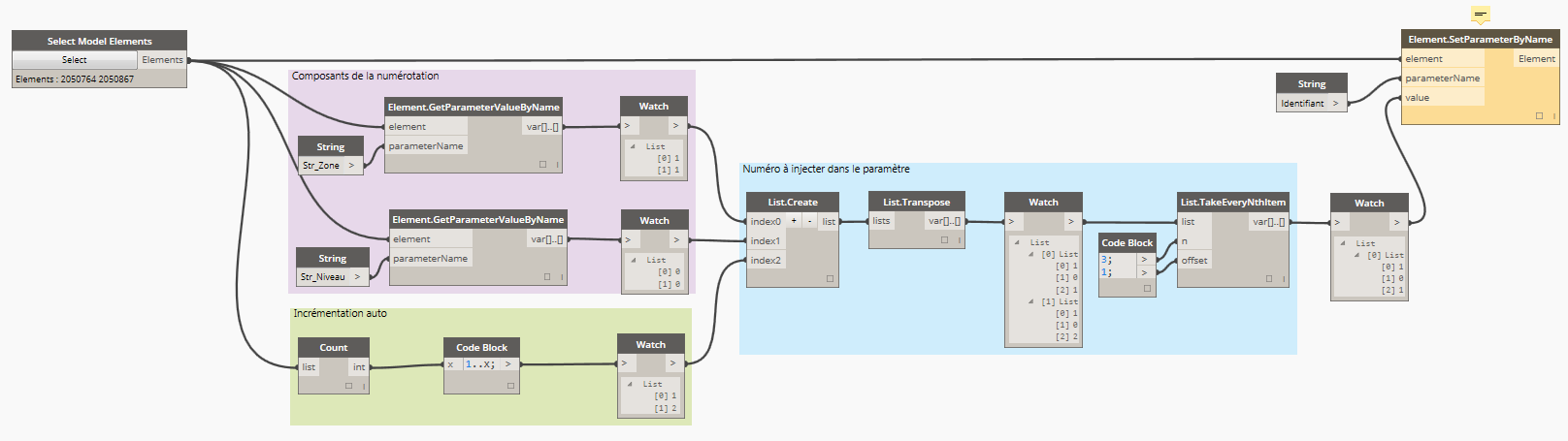 Je cherche à numéroter des éléments avec Dynamo (en injectant un n° dans un paramètre). J'arrive à générer une List avec mes incréments puis je pensais utiliser le bloc Element.SetParameterByName pour intégrer chaque entrée de la liste dans le paramètre voulu de chaque élément ; mais je ne sais pas comment cycler mes différents éléments :(