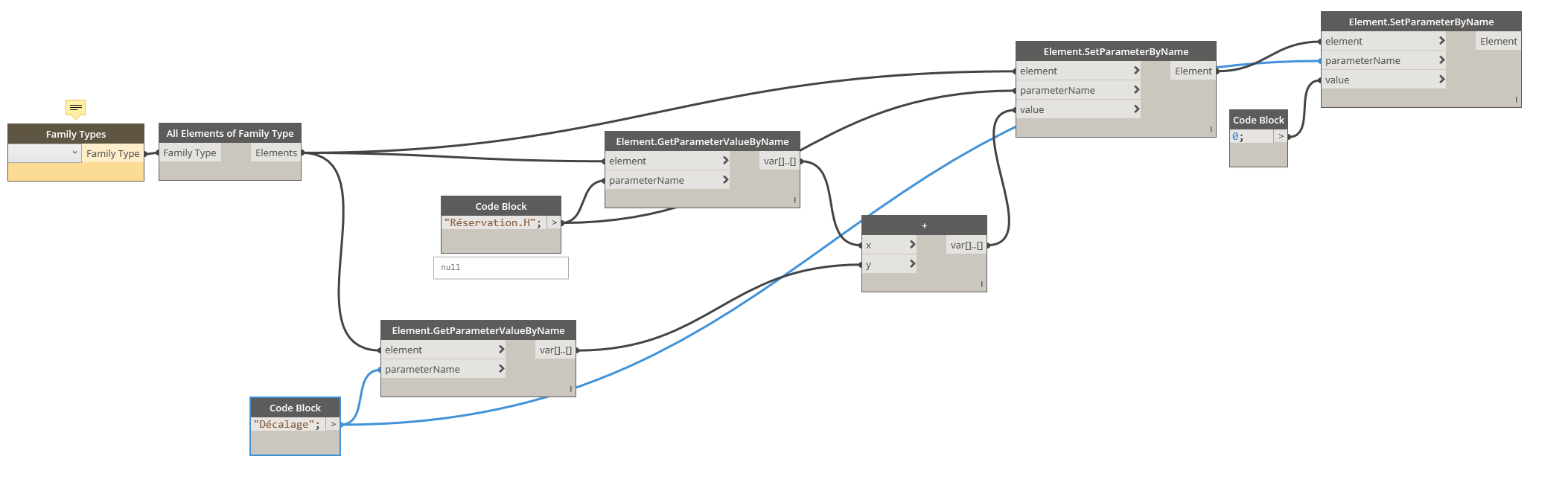 La quasi totalité de mes réservations ayant été implantés de la sorte, je cherche à remettre à zéro la valeur du paramètre de Décalage et à récupérer la valeur pour l'additionner au paramètre de hauteur d'implantation Réservation.H". Seulement il semblerait qu'il ne soit pas possible de réintégrer la valeur calculée dans mon paramètre partagé (paramètre d'occurence), dû moins à partir de mon dernier node → Element.SetParameterByName.