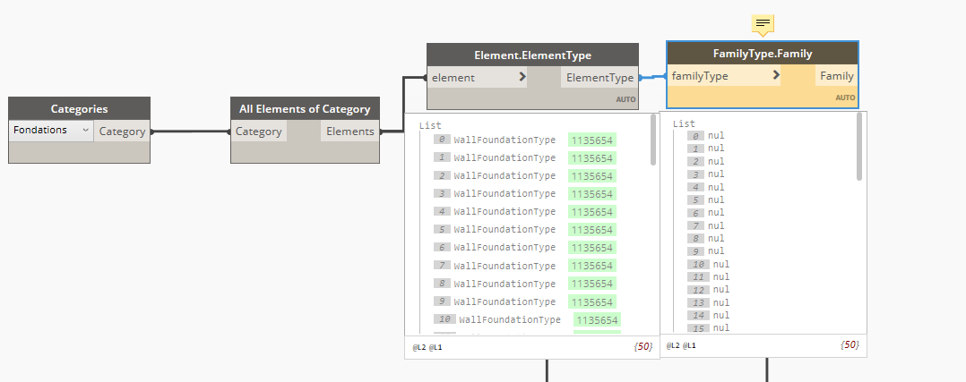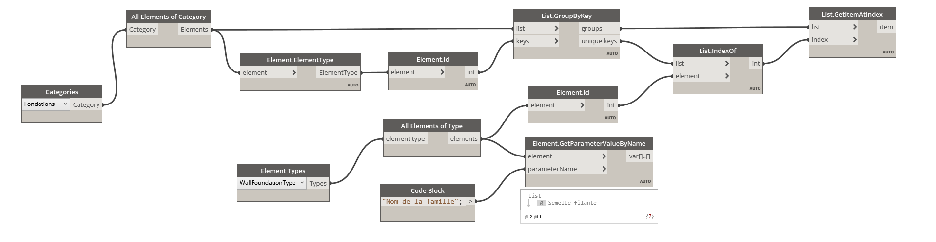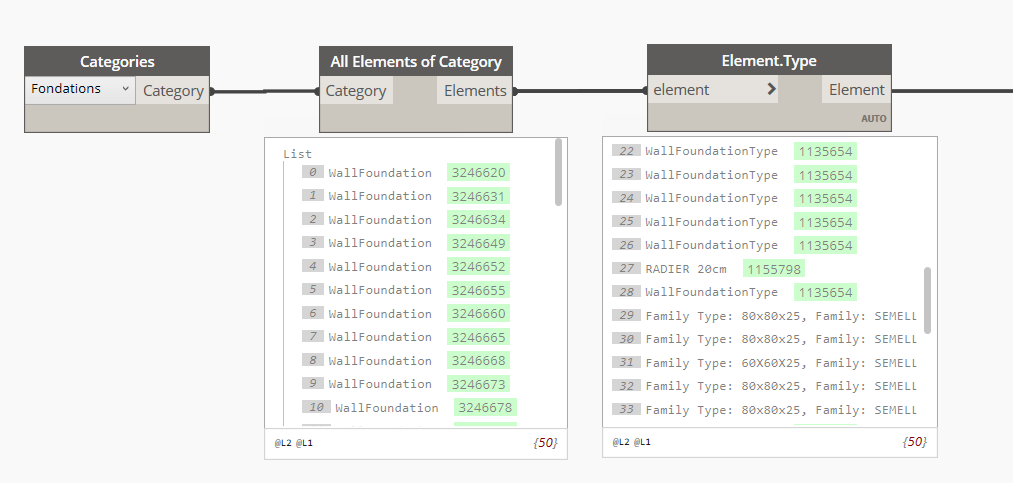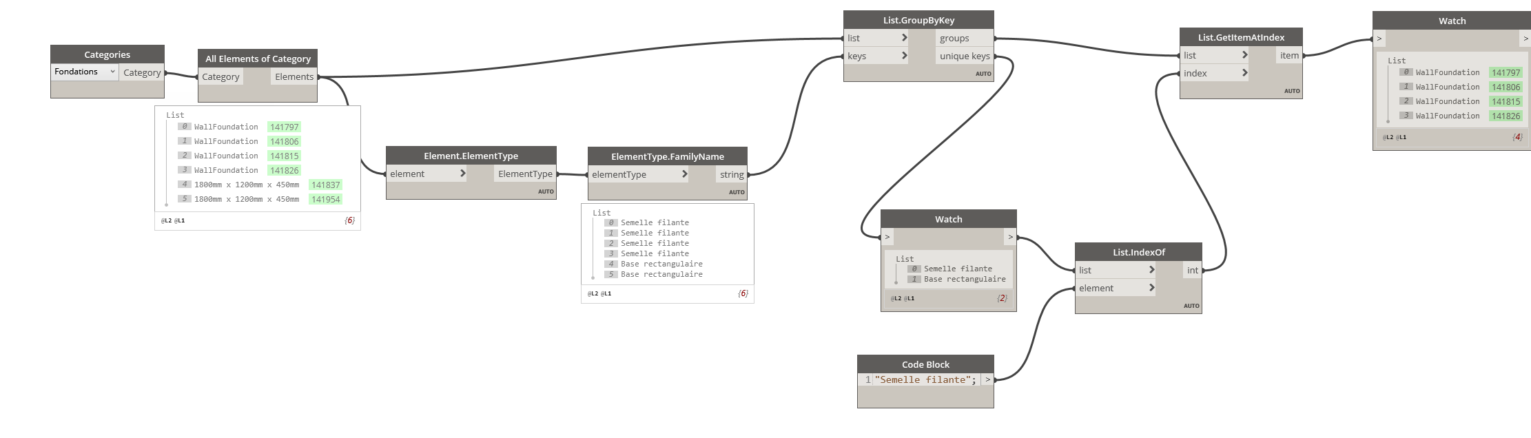C'est vrai que au niveaux des fondations, c'est un peu plus compliqué pour les trouver en dynamo. Ci joint code où je suis passé par "Element.ElementType" et ensuite "ElementType.FamilyName" pour avoir l'information que c'est une semelle filante.