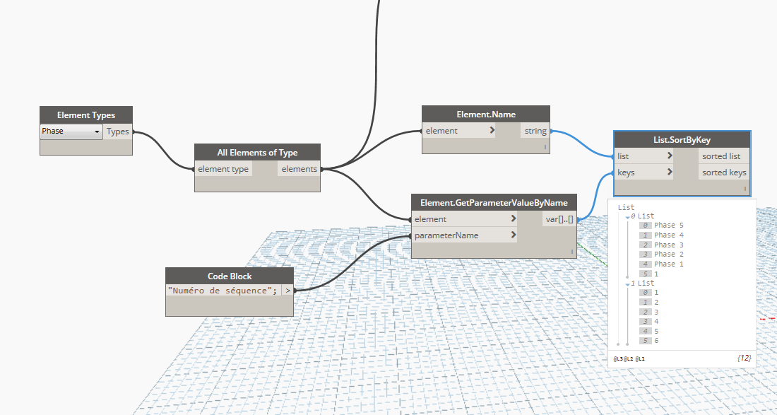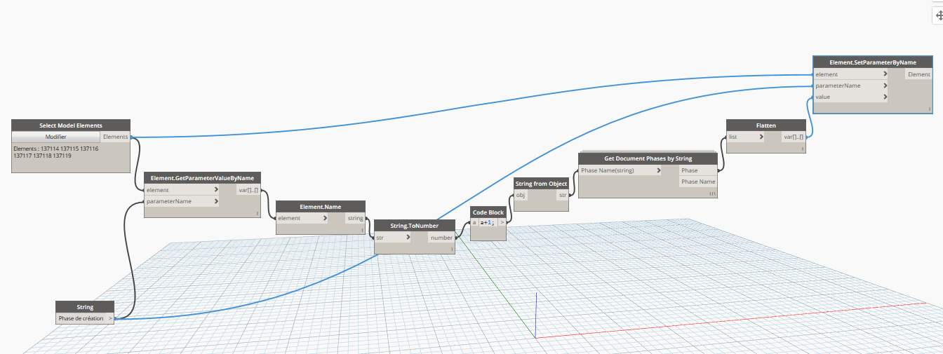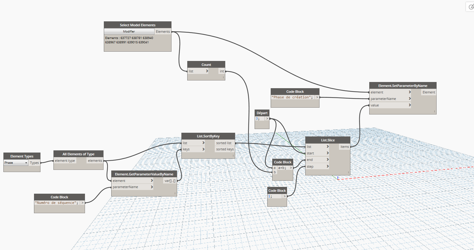 Puis j'ai affecté une phase de création pour chacun de ces 6 sous-éléments. (24 à 29). A partir de là, je souhaite simplement incrémenté de 1 la phase de création de chaque élément (25 à 30 donc). Pour cela, j'ai créé un script Dynamo (cf. pièce jointe "Script Dynamo Phase de création + 1") utilisant le noeud "Get Document Phases by String" du package Clockwork for Dynamo version 1.31.0.