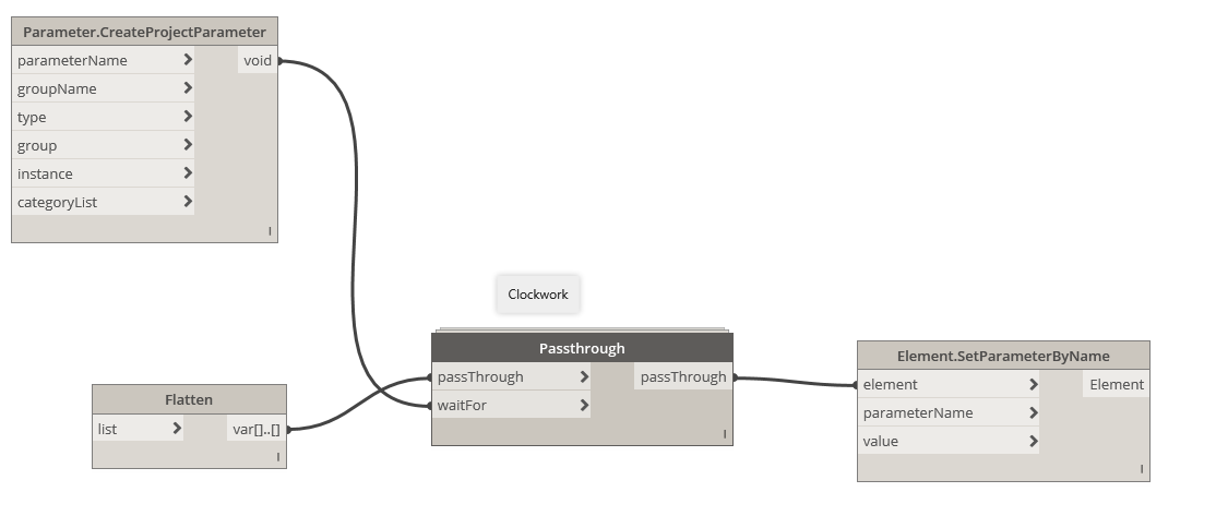 Tu dois faire comprendre à Dynamo qu'il faut créer en premier le paramètre et ensuite injecter les valeurs dans le paramètre.