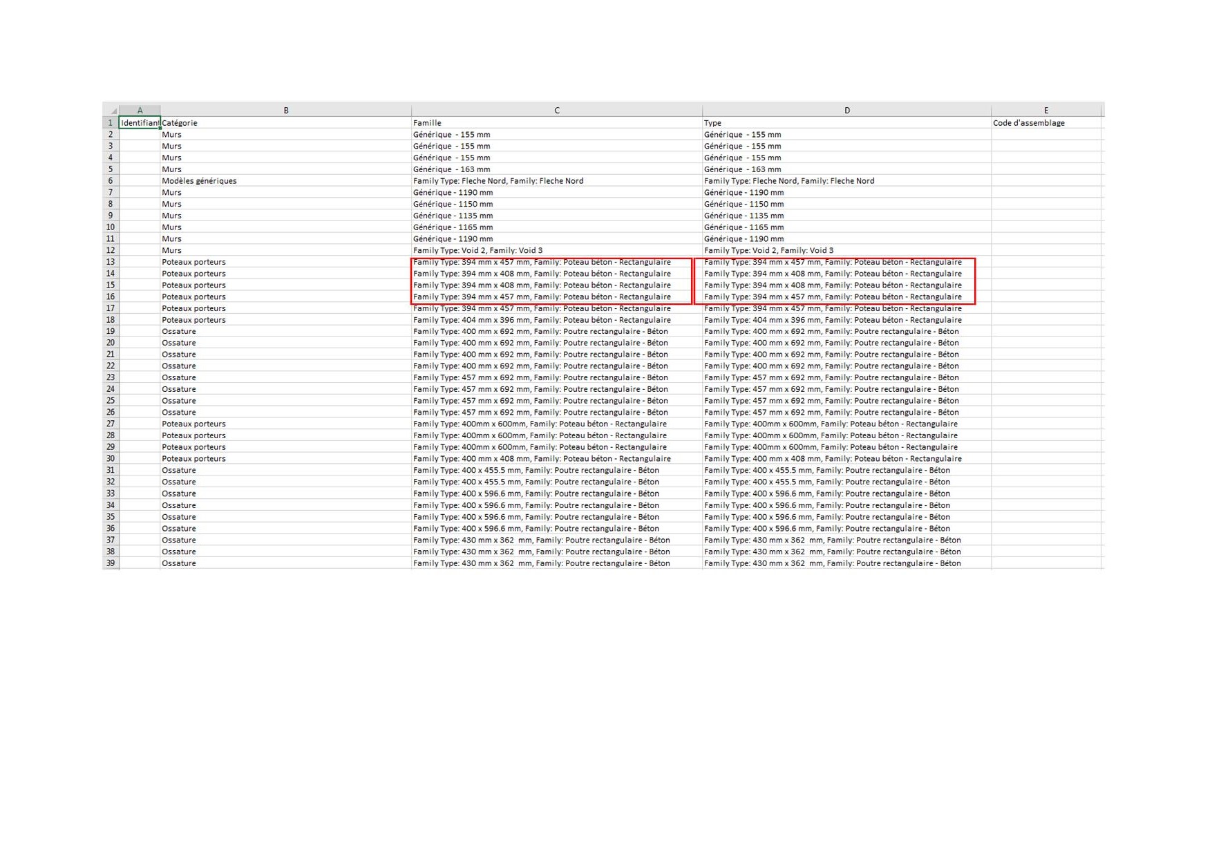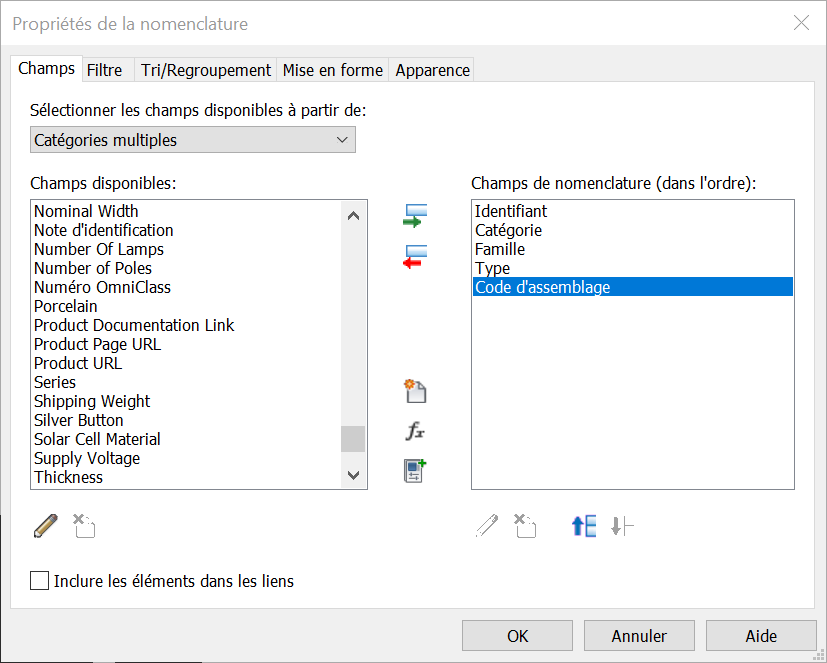Merci Akli le dernier srcipt que tu m'a fourni fonctionne très bien. Maintenant il faudra que je crée le script dans le sens inverse lol... Pour répondre à ta question, en fait j'utilise le code d'assemblage uniformat II car je l'ai chargé dans revit et quand je sélectionne un objet dans ses propriétés je clique sur les 3 petits points du code assemblage et j'arrive sur la liste complète des codes (voir en PJ l'imprim écran).