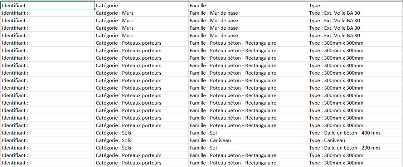 En fait la nomenclature multicatégorie ne trait pas les murs, sol et escaliers. Je souhaite faire un export direct de tous les objets sous cette forme, sauf qu'avec mon code dynamo ça ne me convient pas il m'écrit "Family type :" au lieu d'écrire directement la famille et le type seul.