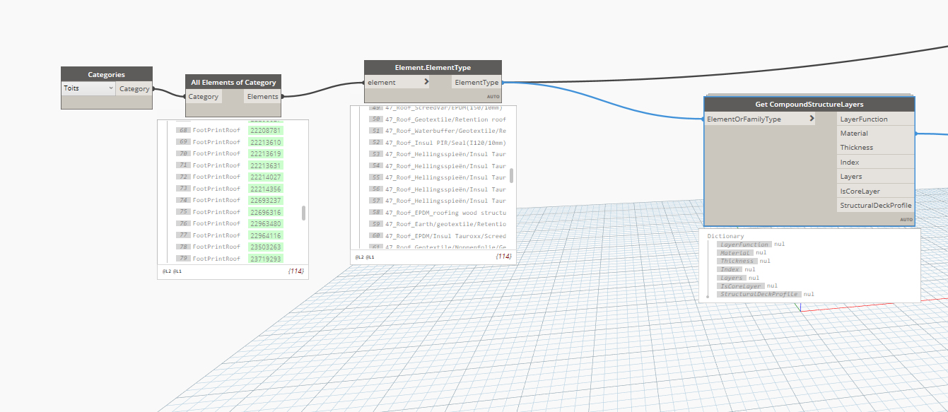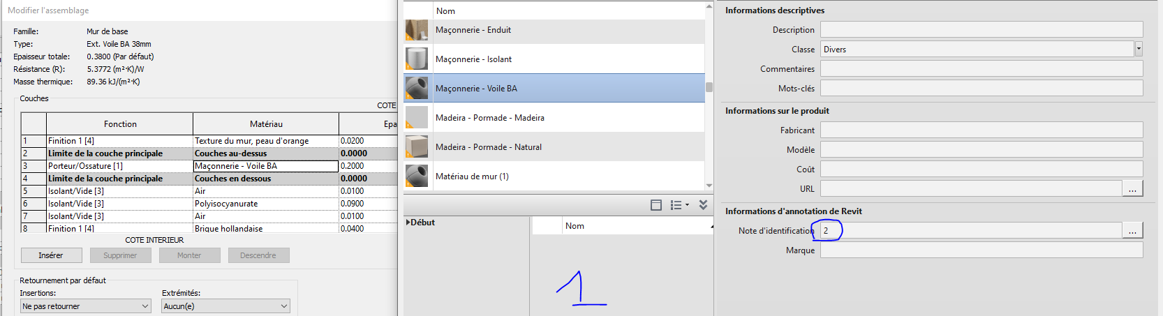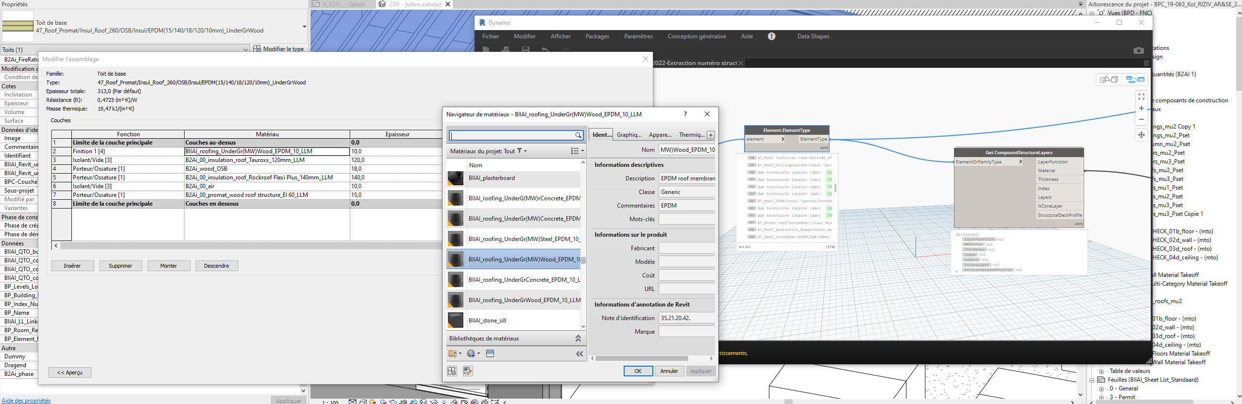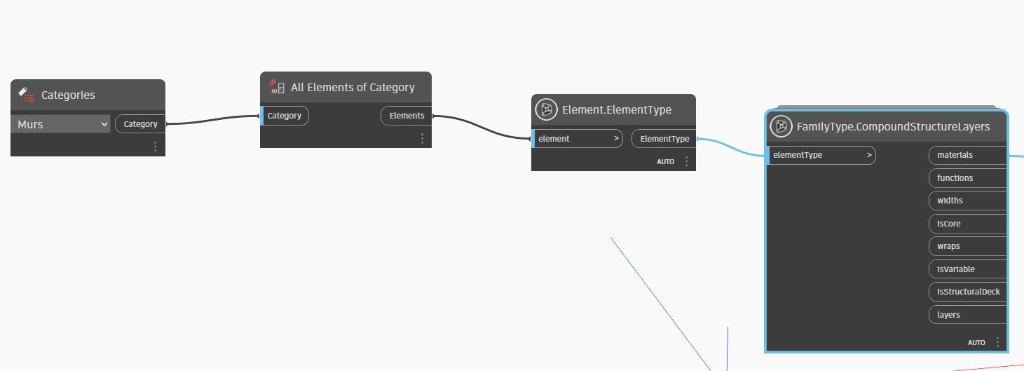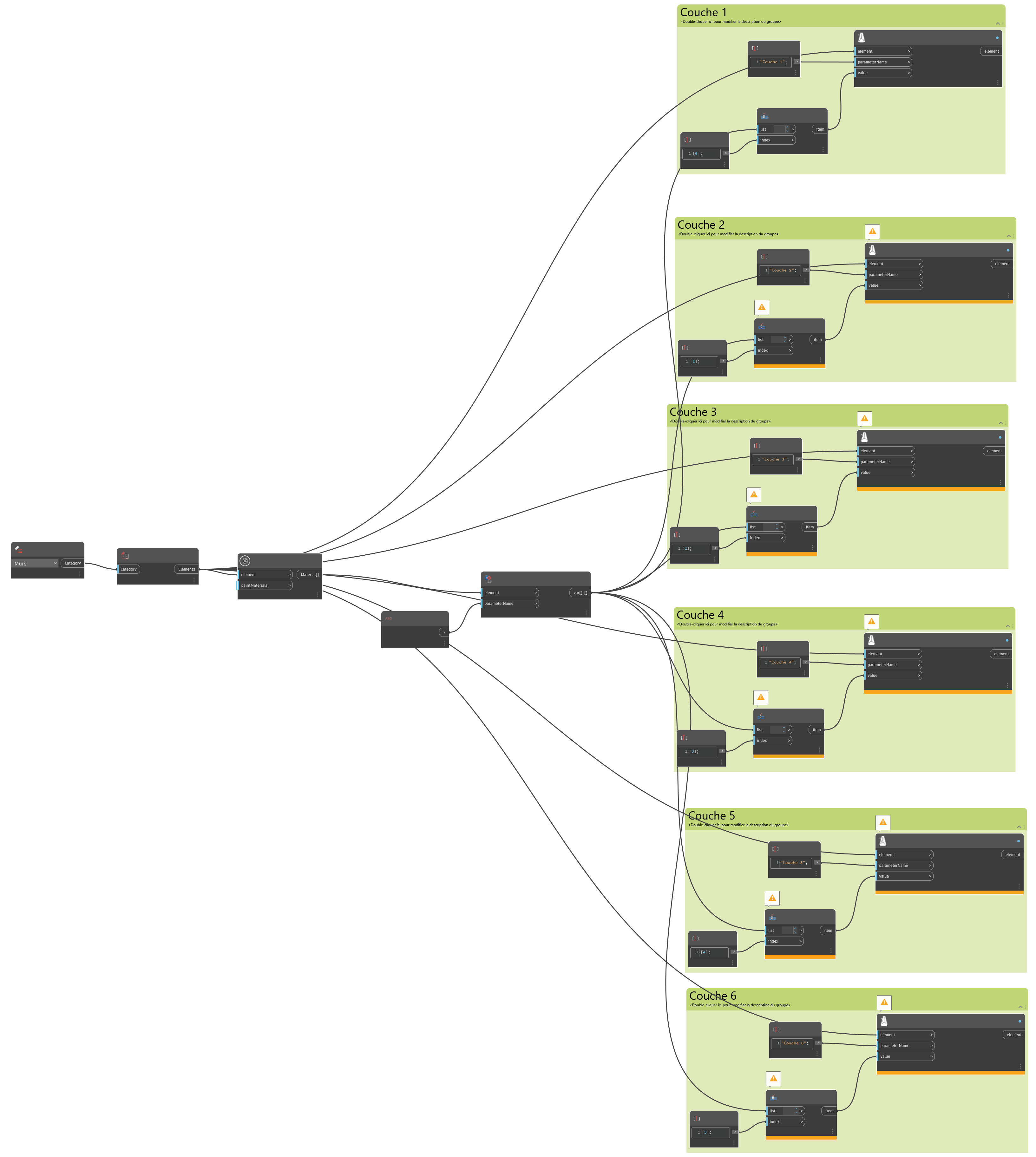 Alors ici dans mon cas j'aimerai pouvoir mettre le numéro qui se trouve dans note d'identification directement dans le matériau (voir image 1). Donc pour arriver à cela j'ai créer tout d'abord 6 nouveau paramètre de "couche" puis ensuite j'ai fais un dynamo qui permet d'extraire chaque note d'identification dans une couche (voir image 2&3) différente mais le problème c'est que les couche s'exporte non pas par ordre de couche mais par type de matériau donc cela fausse tout... Cela est classé par le numéro vert présent sur l'image du nœuds (image 4)