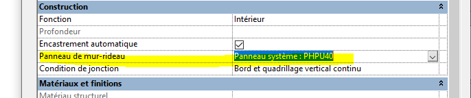 Dans les propriétés "panneau mur rideau" il faudrait choisir une famille "Panneau Système", mais pas un mur de base simple comme c'est le cas chez toi