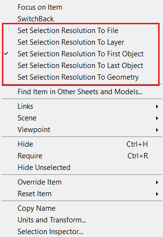Quel est le niveau de sélection choisi (voir pièce jointe, désolé pour les traductions approximatives, mon Navisworks est en anglais)?