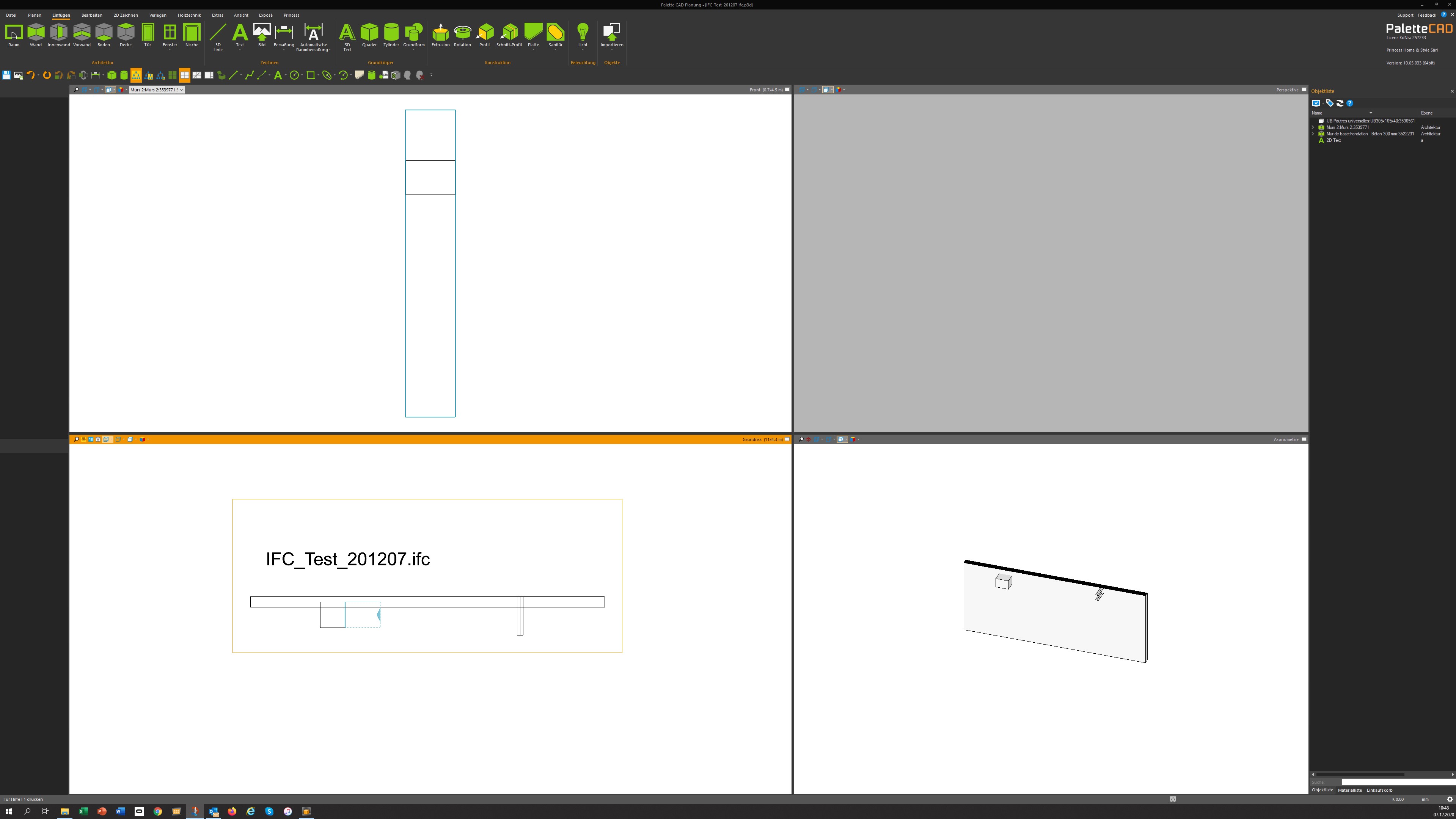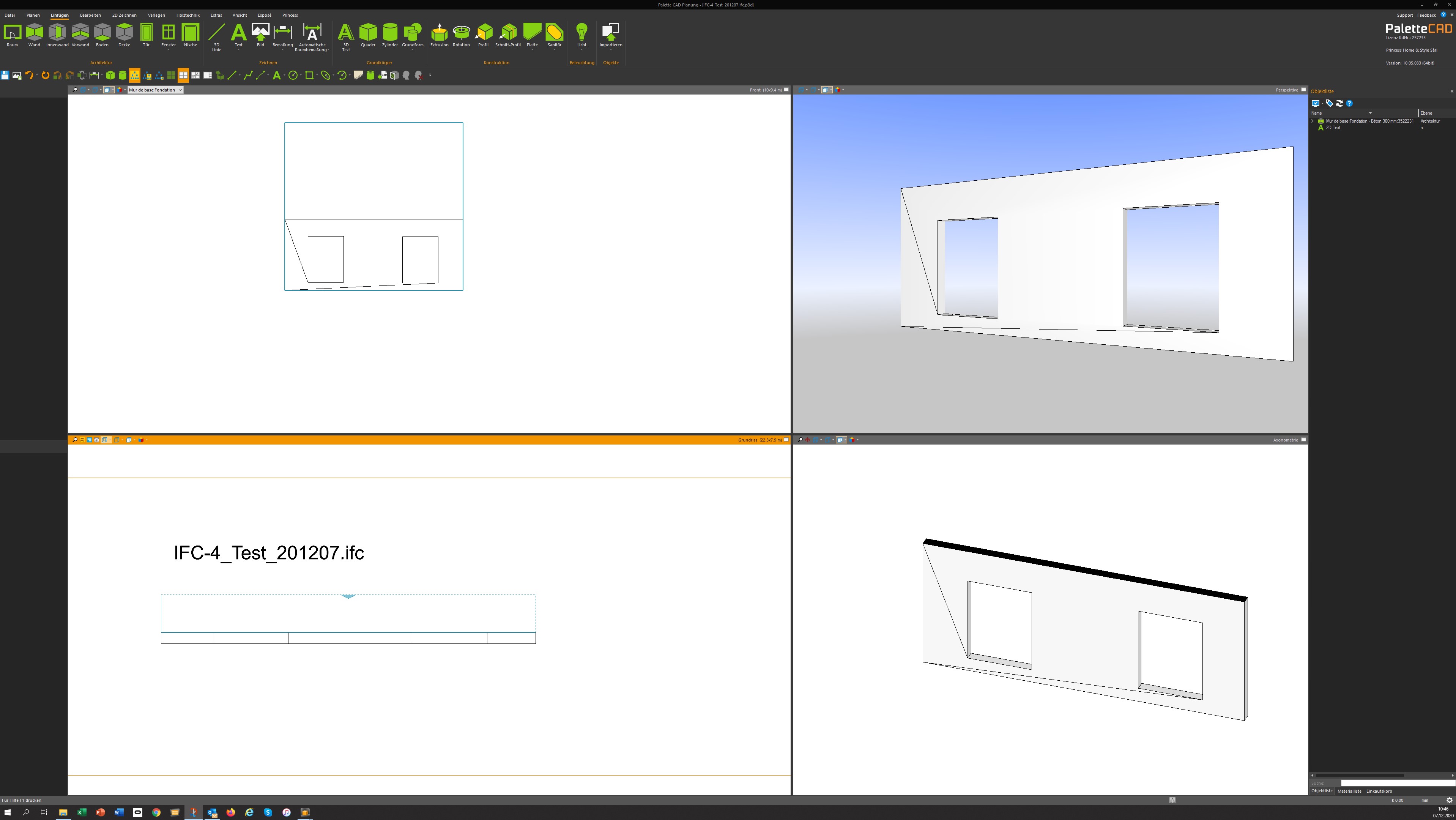 Pour finir le test, j'ai envoyé un IFC2x3 et un IFC4 à mon client. Il a ouvert les deux fichiers dans PaletteCAD et, comme vous pouvez le constater sur ses screens, c'est assez incompréhensible. J'ai sur l'IFC2x3 mes éléments IPE (famille) et Béton (In Situ) et sur l'IFC4 mes ouvertures de baies (Famille et In Situ).