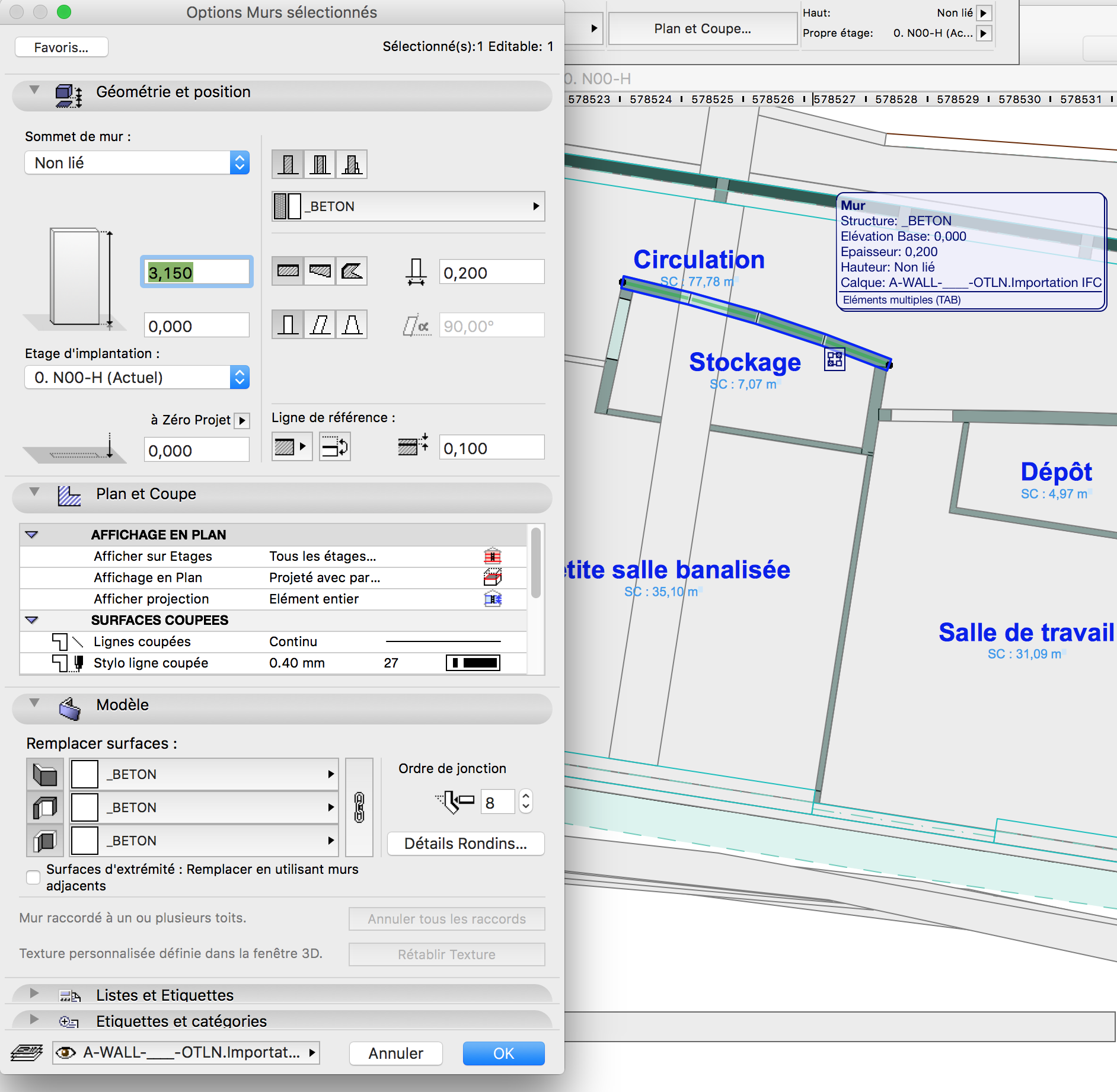 Même bien classifié dans ton logiciel métier ton mur "IFC Wall" une fois exporté via IFC et réouvert dans un autre logiciel métier peut être soit un objet bien classifié mais non modifiable car non reconnu par ton outil correspondant soit être compréhensible et modifiable par l'outil de ton logiciel. Cf ma copie d'écran jointe ou le mur venant de Revit vers ArchiCAD via IFC n'est pas "mort" mais adaptable modifiable transformable avec tous les réglages ArchiCAD des murs (je peut l'agrandir, l'incliner, lui ajouter une porte, le raccorder à un toit comme n'importe quel autre mur directement créé dans ArchiCAD)
