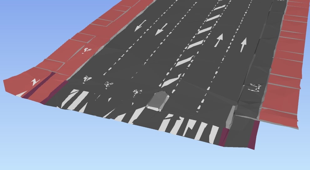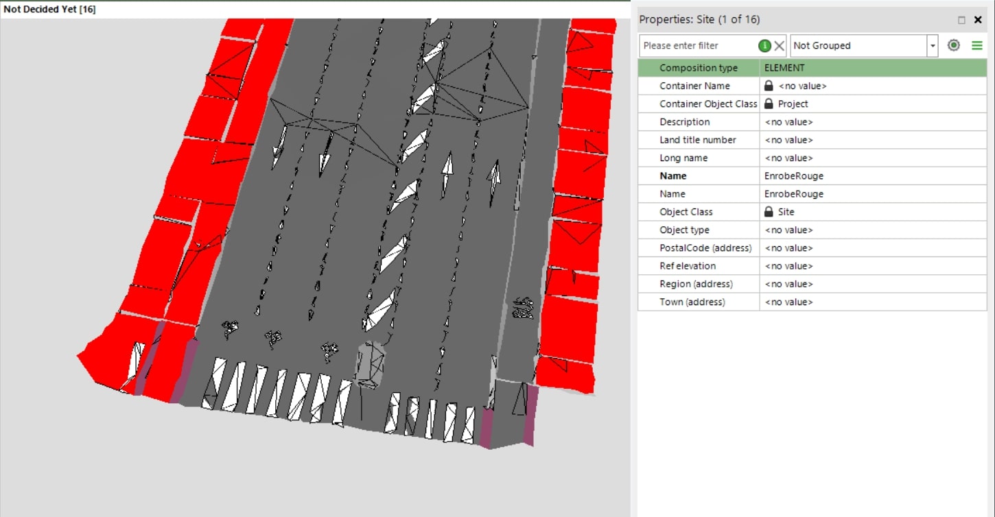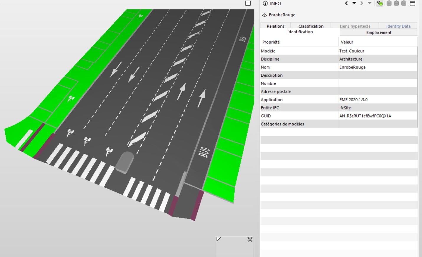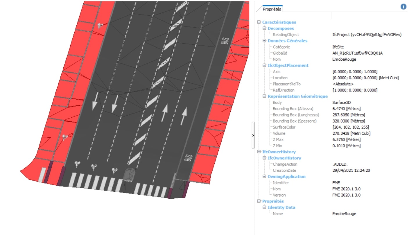 A l’aide de plusieurs scripts FME je génère des fichiers IFC contenant des MNT (surfaces topographiques) séparés en plusieurs surfaces distincts représentant les différents terrains (route, trottoir, bordure, espace vert, etc.).