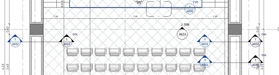 cependant dans le cas ou on a un détail qui se répète (similaire=SIM) parfois en (symetrie=SYM) vous pouvez encore mettre (type=TYP) ..ce que vous voulez, et pour ne pas créer une multitude de coupes on ne crée qu'une seule contenant le détail en question (nb: elle peut être une vue de dessin) et puis dessiner d'autre coupes dans les endroits ou le même détail existe MAIS les référencer a la premier coupe/vue de dessin, on aura donc plein de traits de coupe en plan mais elles réfèrent toutes une seul vue de dessin/coupe