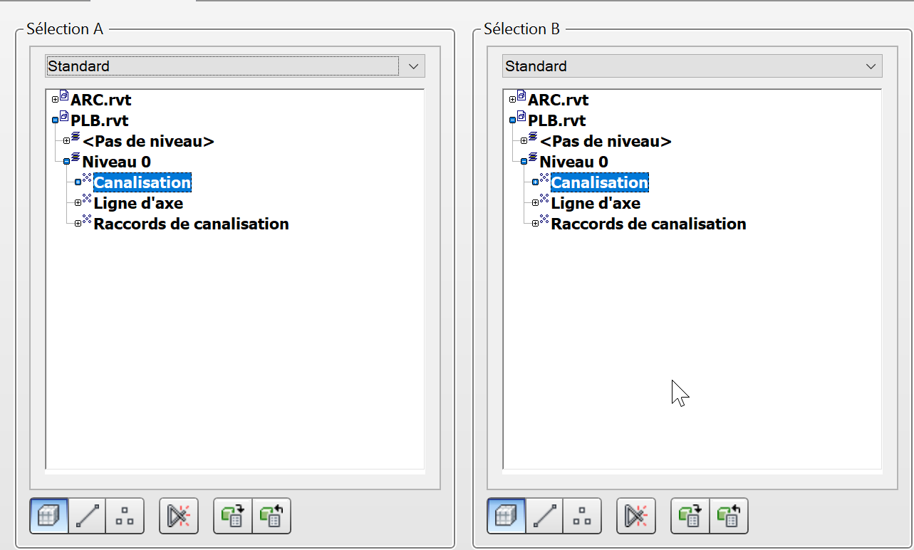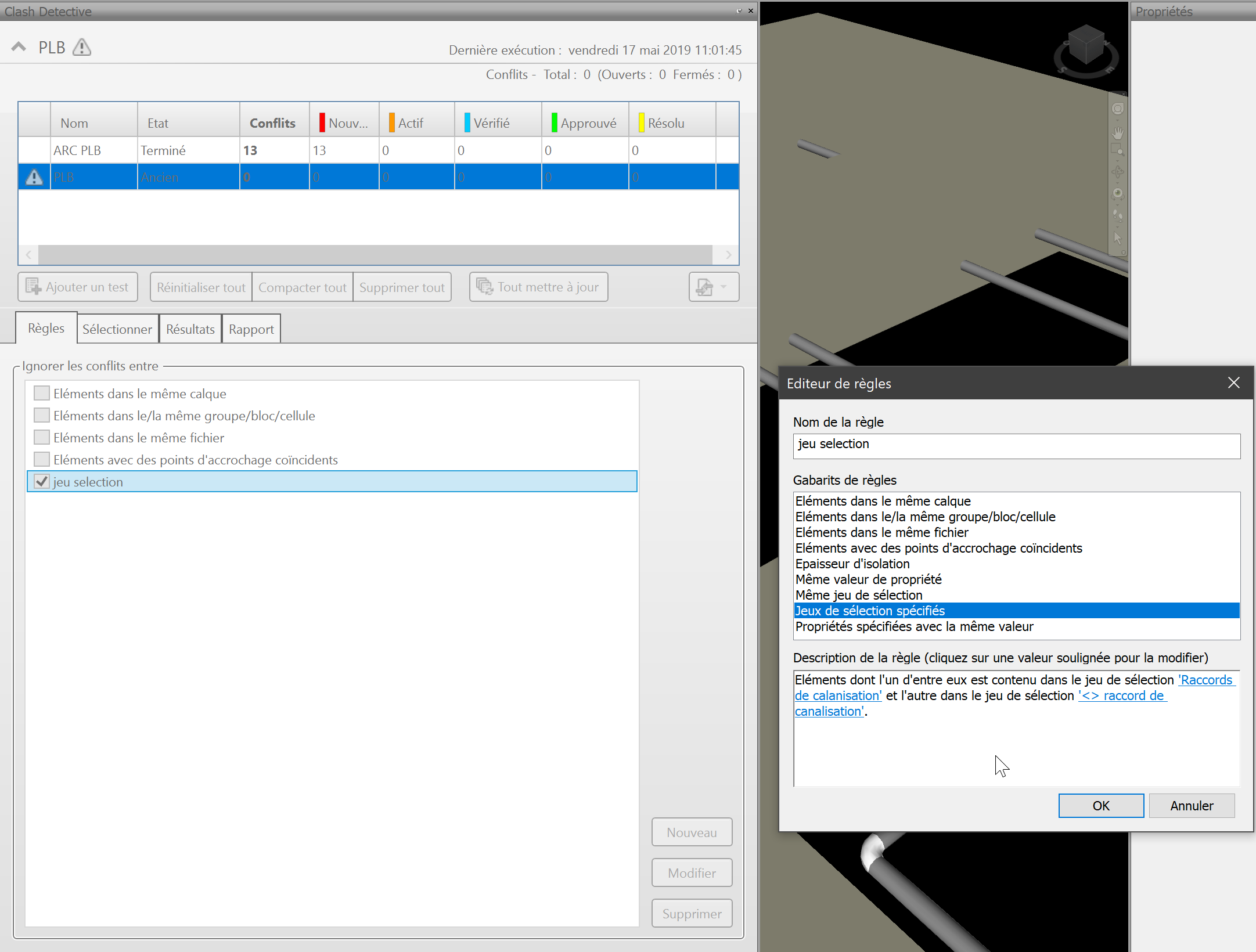 Si la détection se fait entre deux modèles distincts, le modèle Gros-Oeuvre et le modèle Plomberie par exemple, je ne cherche pas à savoir si une canalisation entre en conflit avec une autre canalisation dans le modèle Plomberie, mais plutôt si une canalisation du modèle Plomberie entre en conflit avec un mur du modèle Gros-Oeuvre.