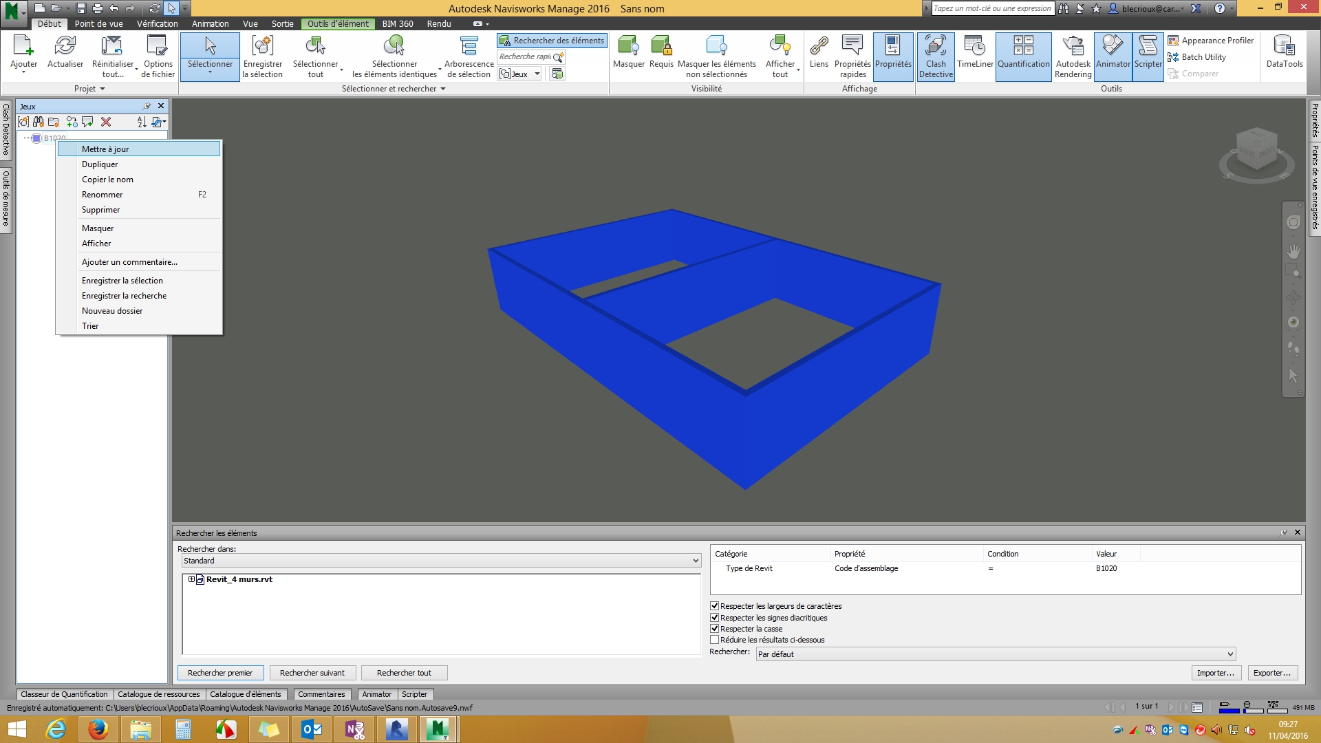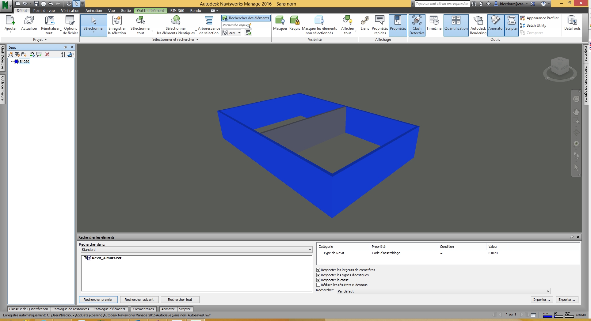 1) Je charge un 1er fichier avec 4 murs et je fais une sélection par code d'assemblage. Je crée ensuite un 1er jeu de sélection. J'enregistre ma recherche en .xml à partir de la fenêtre Rechercher des éléments/Exporter