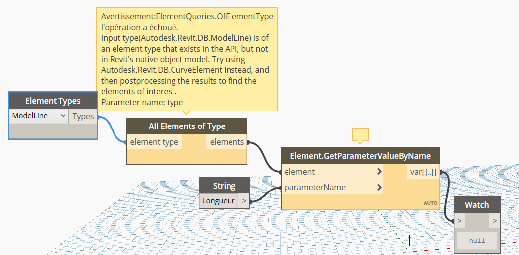 Sur Dynamo, j'ai cet avertissement qui s'affiche. Pj (En gros : C'est un type d’élément existant dans l'API mais pas dans le modèle natif de revit). Ça fonctionne bien avec des murs mais là... je sèche.(Dans l'exemple ci-dessous je n'ai pas filtré les styles de lignes données qui m'intéresse).