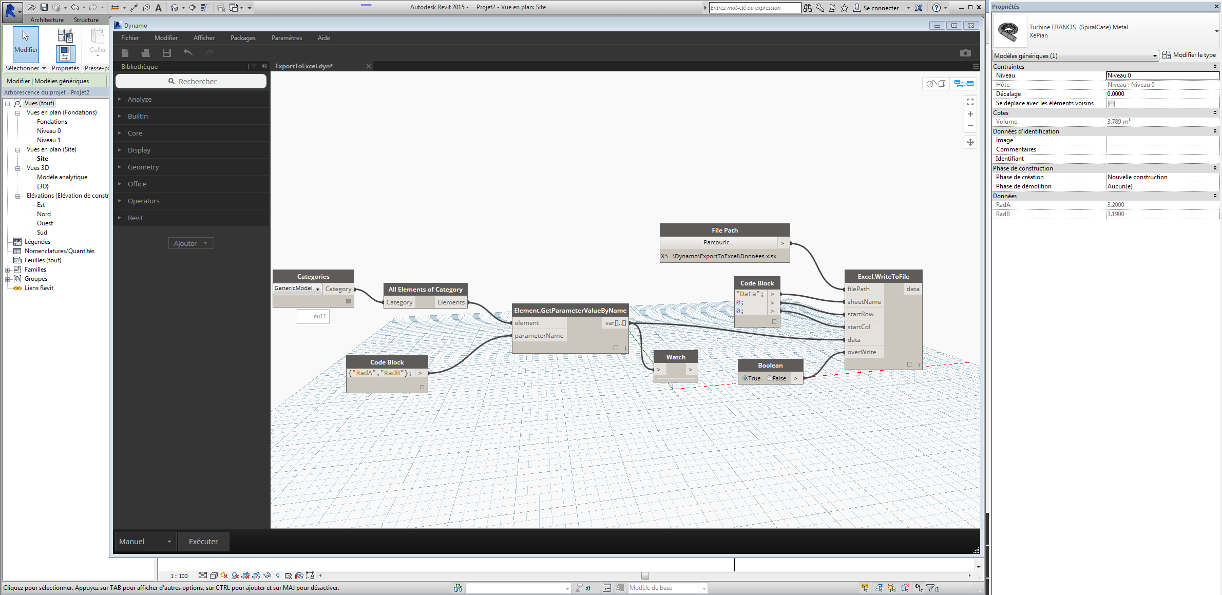 a propos de la vidéo de daniel si l'on veut exporter non pas un paramètre mais deux, il faut faire deux Element.getparameterValuebyname puis une liste.create pour assembler les deux listes de paramètres et enfin un list.transpose pour mettre ces valeurs dans deux colonnes sous excel.
