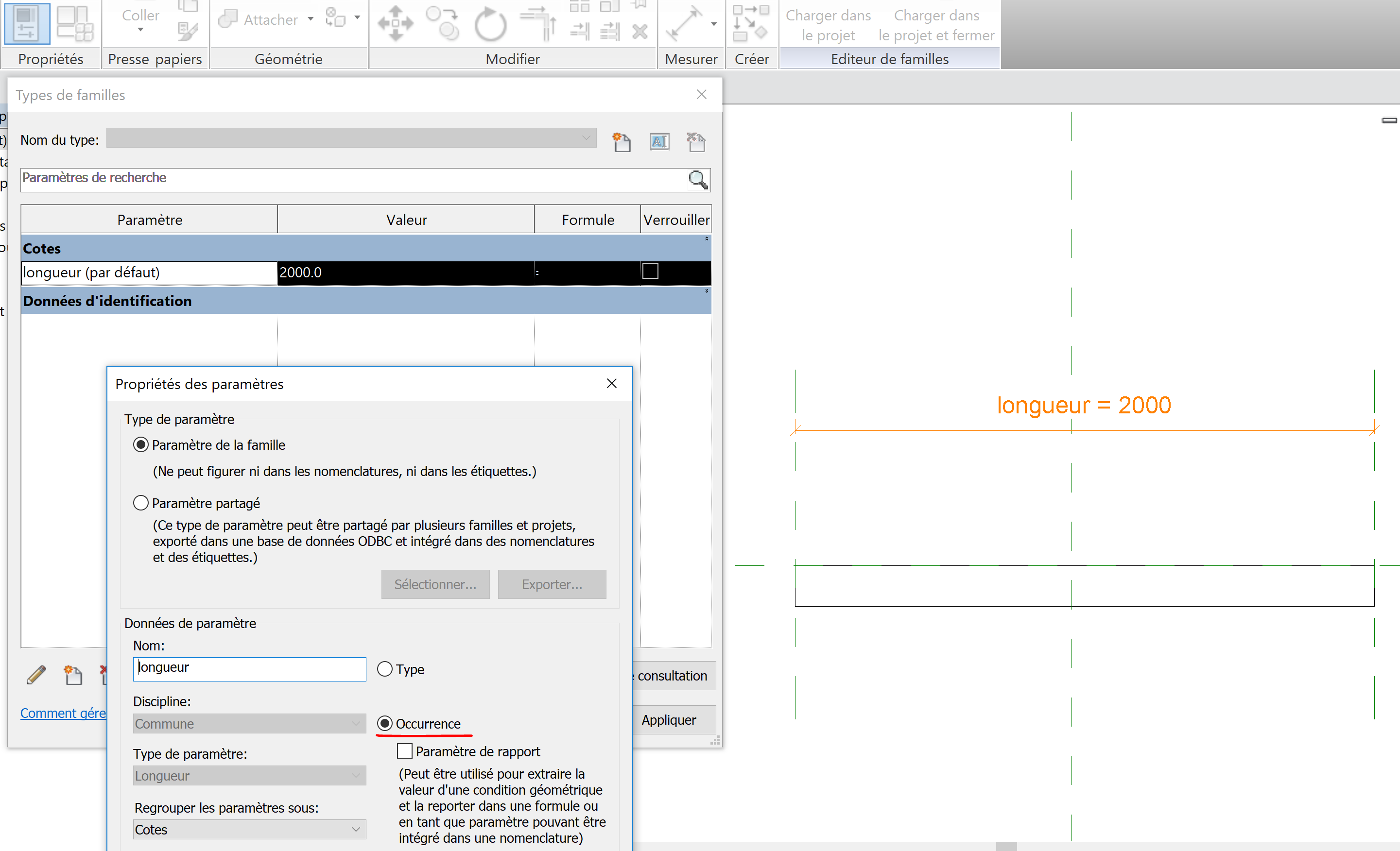 Il faut créer des paramètres d'occurrence pour pouvoir modifier les dimensions de la famille avec les flèches.