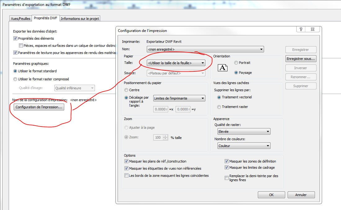 Orientation Portrait/Paysage combinée : Export DWF