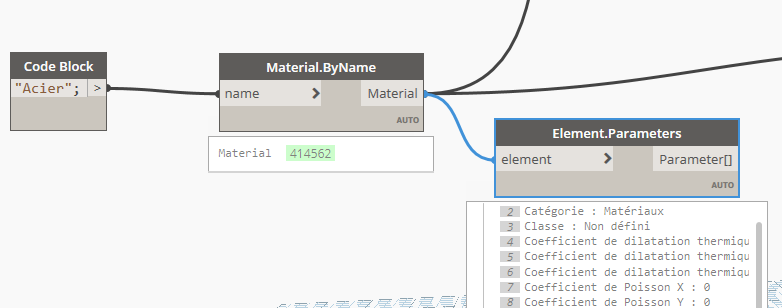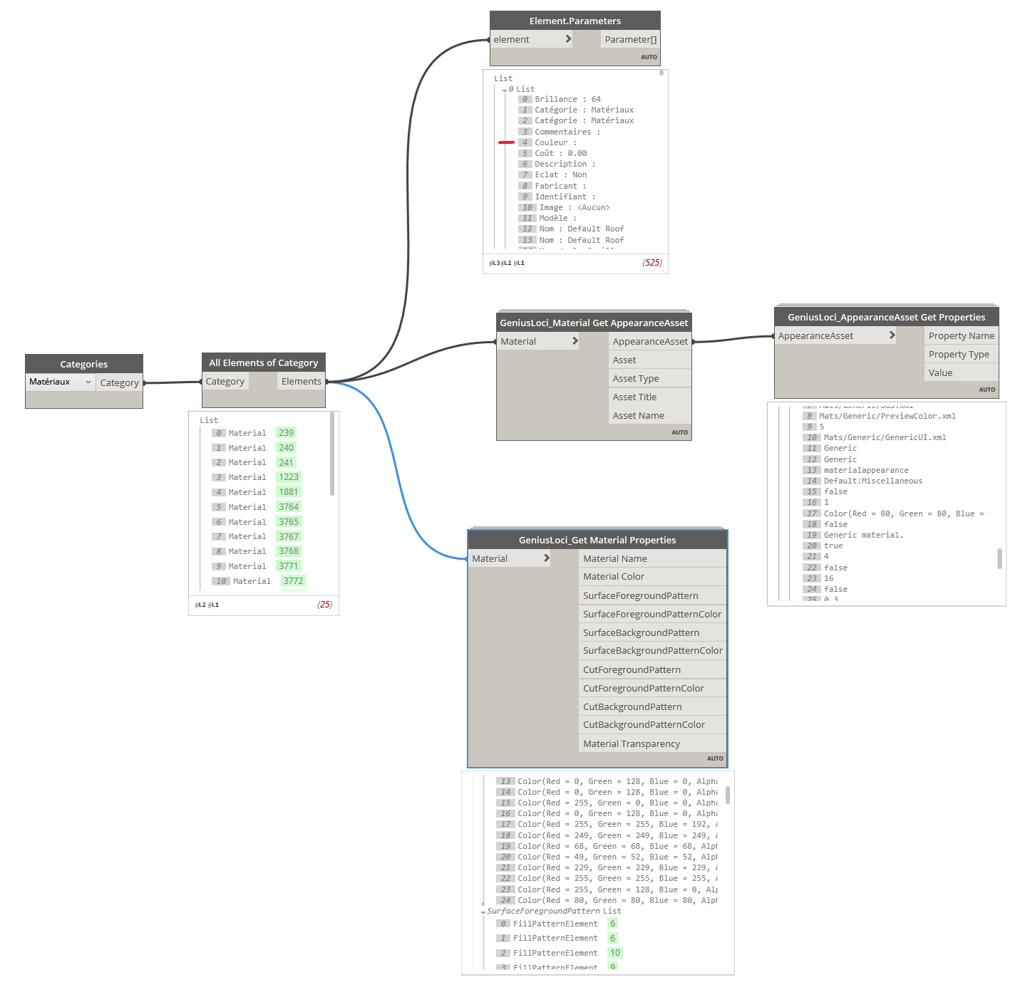 Le noeud "Element.Parameters" est extrêmement limité. Par exemple, la couleur du matériaux n'est pas récupérable.