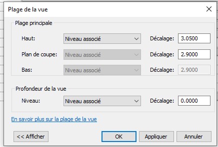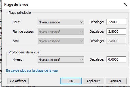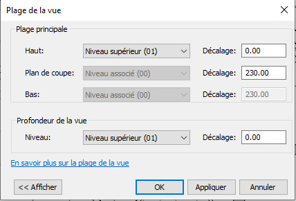 - Plan de coupe : doit être inférieur au plan haut (en plan archi, cette valeur est classiquement de l'ordre de 1.2m)