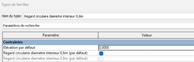 J'ai créé une famille où j'ai un regard qui fait 0,6m de diamètre intérieur et un autre qui fait 0,8m. J'ai mis un paramètre (oui/non) pour faire apparaître soit celui à 0,6m soit celui à 0,8m. Puis j'ai créé 2 types dans la même famille où je coche l'un ou l'autre (voir capture d'écran Problème paramètre oui-non_1 et Problème paramètre oui-non_2). Quand je suis dans la famille pas de problème ça fonctionne. Quand j'insère ma famille dans mon projet, il y a un problème (voir capture Problème paramètre oui-non_dans projet) dans mon regard 0,8m c'est 0,6m qui est coché. Est ce que quelqu'un pourrait me dire pourquoi il ne garde pas en mémoire ce que je fais dans ma famille ?