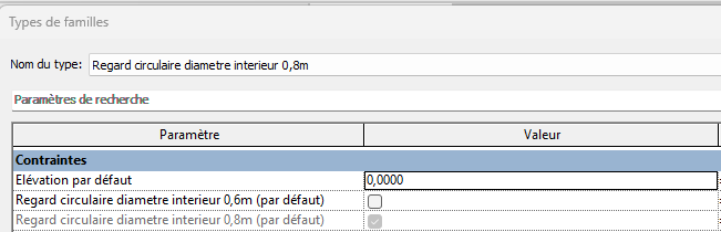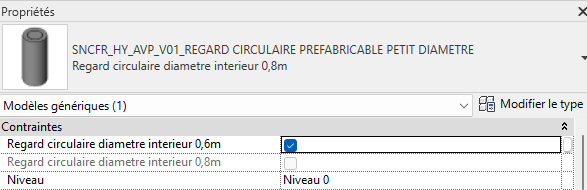 - Vous êtes revenue dans la famille, avez ajouté la formule =not([Regard circulaire diametre interieur 0,6m]) pour piloter le paramètre du regard de 80cm