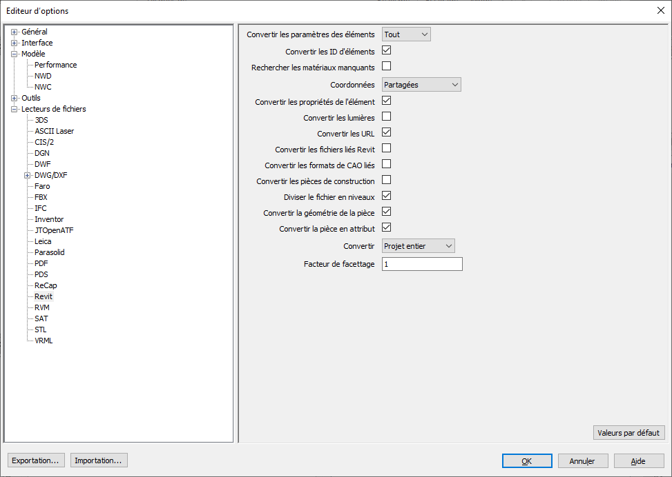 Merci pour ta réponse ! Hélas, j'avais déjà coché ces options et le problème provient du fait que les éléments REVIT ont étaient modélisés comme "element in situ" et la visualisation ne se fait pas sur Navis...