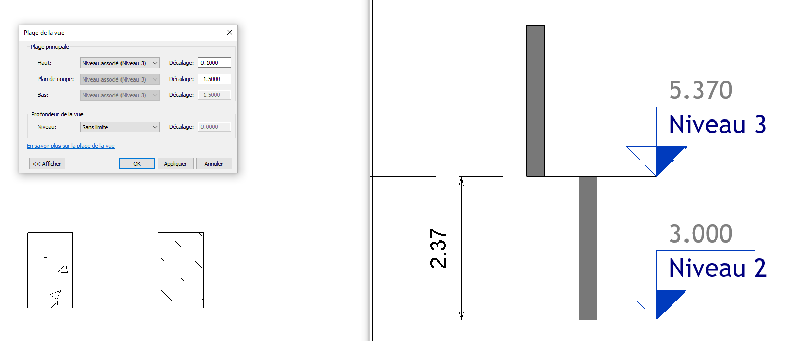 Si mon niveau fait moins de 2.37m de hauteur, le motif de coupe des poteaux se changent en motif de projection alors que le plan de coupe de la plage de vue coupe au même endroit, la hachure devrait donc rester en motif de coupe peu importe la taille du niveau tant que le plan de coupe est bien placée.