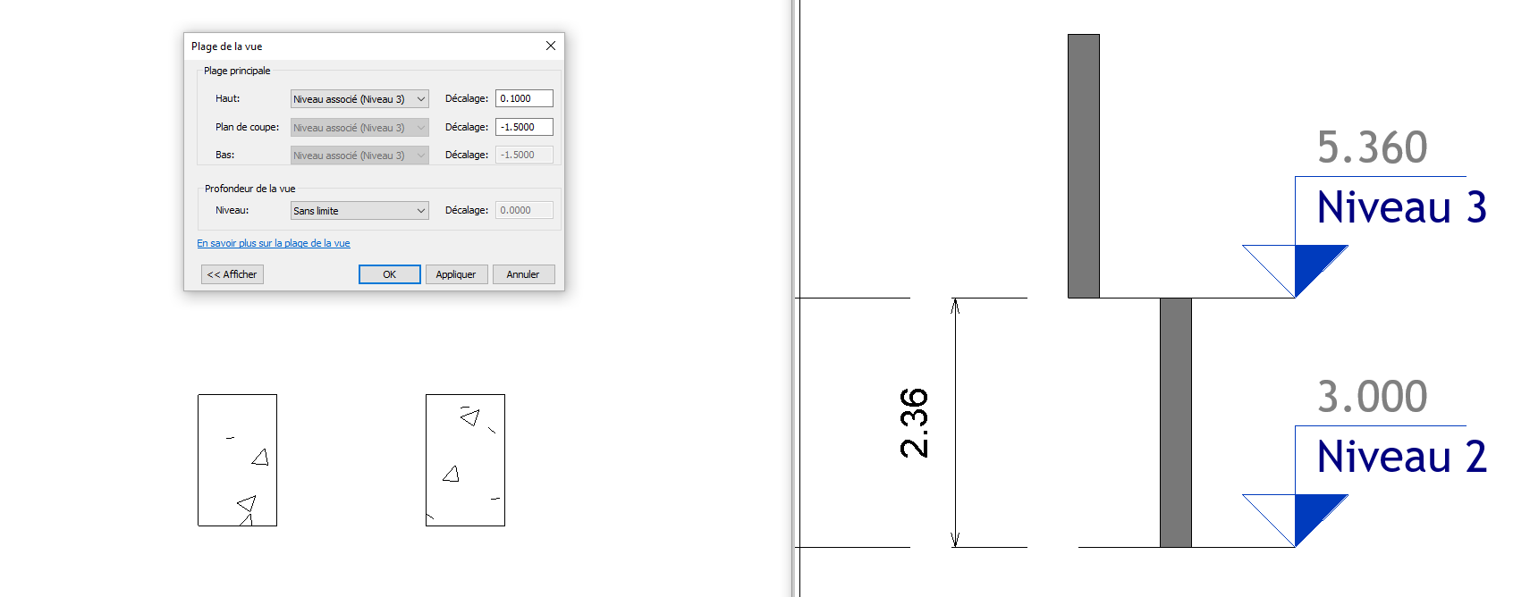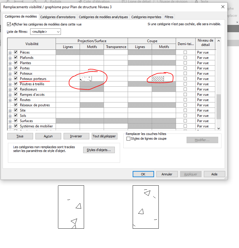 Je vous mets des captures d'écran pour mieux comprendre, une avec un niveau à 2.37 m où les motifs de projection et de coupe sont corrects et une avec un niveau à 2.36 m où le motif de coupe s'est changé en motif de projection ainsi qu'une dernière avec les paramètres de visibilité des poteaux.