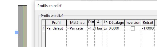 Exemple : Insèrer une fenêtre. Décocher la case "Découpable". Règler le retrait sur 10cm. Le profil en relief (ou en creux) s'arrêtera 10cm avant d'arriver à la fenêtre. Avec un signe moins ça le fera dépasser de 10cm.